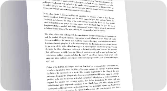 ! A FLAWED DEAL The existing UN restrictions on ballistic missiles prohibit all states from providing technology or assistance to Iran that would help the regime to advance its ballistic missiles programme, with specific reference to missiles that could serve as a delivery system for a warhead. Yet it appears to be for this very reason that, since the release of the JCPOA Iran has denied that the restriction concerning missiles is actually binding upon it. Indeed, Iran argues that the agreement already frees it from any restrictions on missile technologies. Addressing the Iranian parliament after the signing of the agreement, Iranian Foreign Minister Mohammad Javad Zarif claimed that since the clause specifically details missiles capable of carrying a warhead—and since Iran claims not to be seeking to develop any such warhead or the missiles for carrying one—this prohibition could not be said to apply to Iran. This raises further concerning questions about whether or not Iran will even seek to comply with the remaining period of the embargo. With other articles of international law still forbidding the shipment of arms to those that are widely considered Iranian proxies such the Assad regime in Syria, Shia rebels in Yemen, and Hezbollah in Lebanon, the lifting of the arms embargo theoretically should not allow for this move to benefit terrorist groups and rogue regimes across the Middle East. Yet, given that Iran is long known to have supplied such clients with arms and financial support anyway, it is reasonable to believe that the lifting of the arms embargo will only assist Iran in these activities. The lifting of the arms embargo will also run alongside the upfront unfreezing of Iranian assets and the gradual lifting of sanctions, representing tens of billions of dollars which will rapidly become available to the Iranian state. While the regime will certainly use some of this income for legitimate domestic purposes, it is also widely suspected that the Iranian government may attempt to use some of this influx of funds to support its regional proxies and terrorist groups. Coming alongside the lifting of the arms embargo, it is also anticipated by many observers that the funds that will become available from the lifting of sanctions could well be used to bolster Iran’s conventional military capacity, including the country’s air defence systems, which in turn could make any future military option against Iran’s nuclear programme far more difficult and costly to carry out. Critics of the JCPOA have argued that even if the deal can be shown to have some merits with regards to the nuclear issue, the lifting of the arms embargo and embargo on ballistic missiles invalidates the agreement as a whole. The potential implications of the lifting of the arms embargo, alongside the lifting of other financial restrictions that will leave the regime in a stronger position to be able to increase its level of conventional militarisation, as well as continuing its support for proxies and terrorist groups, thus further destabilising the region and also emboldening Iran’s hegemonic ambitions in the Middle East. This, taken with the potential inadequacies of the agreement on the nuclear front, risks harming the regional and global security situation and ultimately making the current Iranian regime a far more dangerous force than it already is. Conclusion The deficiencies of the JCPOA concern both the nuclear and non-nuclear aspects of the agreement. On the nuclear front it remains unclear as to whether the terms of the agreement are 9 ! !