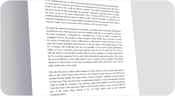 ! A FLAWED DEAL Since the document leaked by the Associated Press is understood not to be the only such side agreement, further concerns remain about what else may have been agreed to. However, with these additional documents remaining undisclosed to the public, it will be difficult for observers to make a full and comprehensive assessment of the strengths and weaknesses of the agreed upon inspections regime. 1.2 Sanctions Snap-Back In the event that inspectors are able to demonstrate that Iran has breached the agreement directly, or if Iran openly breaches the agreement by preventing inspections from taking place, then there would be the need to for a swift and effective response. The Obama administration has argued that such a breach by Iran would trigger the automatic “snap-back” of sanctions. However, under the terms set out in the Joint Comprehensive Plan of Action (JCPOA), the procedure for reimplementing international sanctions would be neither swift nor immediate. As with the case of inspectors requesting access to Iranian military and undeclared sites, the agreement puts in place a long and complex series of procedures before sanctions can be put back in place. If, despite the relatively weak inspections procedures, the IAEA is able to determine that Iran has breached the terms of the agreement, then the complaint would have to once again be referred to the Joint Commission. Technically, the commission has 15 days in which to consider the complaint. However, the members of that committee—which include Iran—can decide to extend the period of consideration. If these deliberations are still unable to resolve the matter, then any party that remains unsatisfied would then have to refer the matter to the foreign ministers of the P5+1 countries, who would then also have an extendable 15-day period of further deliberation. Failure to reach a consensus at this stage would then open the way for either the US or Iran to refer the matter to a special three member advisory board; consisting of a member appointed by the US, a member appointed by Iran, and a third independently appointed member. Once again, this group would have 15 days within which to issue an opinion on the complaint. That opinion will then be referred back to the Joint Commission, which will be allowed five more days for further deliberation on the matter. Only after this process, which could continue for 35 days at the very least, can the matter then be taken to the United Nations and referred to the Security Council. However, the JCPOA also specifies that this should only happen where a breach constitutes “significant non-performance” on Iran’s part. There has been some scepticism about whether or not an international consensus could be rebuilt for returning to the sanctions regime that predated the interim negotiations. Under the terms of the agreement, failure by the Security Council to restore sanctions within 30 days of the matter being referred to the UN body would result in their automatic reimplementation. While this stipulation should theoretically ensure that restoring sanctions could not be blocked by either a Russian or Chinese veto, the agreement does in fact allow for the Security Council to reject the reimplementation of sanctions after the additional 30-day period, stating simply that the automatic reimplementation of sanctions would take place “unless the UN Security Council decides otherwise.” Therefore, as can be seen from the details of the agreement, the snap-back of sanctions is by no means guaranteed and is far from immediate or automatic. Assuming that 6 ! !