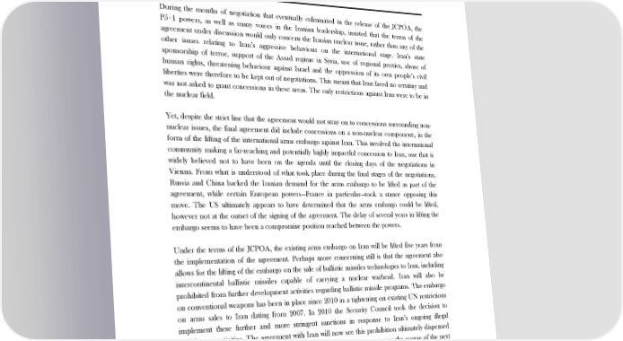 ! A FLAWED DEAL treaty. The proposal here being that, as with sanctions relief, the terms relating to restrictions on enrichment (and the inspections monitoring Iranian compliance) would also remain in place for an open ended period of time. 2. Lifting of the Arms Embargo ! During the months of negotiation that eventually culminated in the release of the JCPOA, the P5+1 powers, as well as many voices in the Iranian leadership, insisted that the terms of the agreement under discussion would only concern the Iranian nuclear issue, rather than any of the other issues relating to Iran’s aggressive behaviour on the international stage. Iran’s state sponsorship of terror, support of the Assad regime in Syria, use of regional proxies, abuse of human rights, threatening behaviour against Israel and the oppression of its own people’s civil liberties were therefore to be kept out of negotiations. This meant that Iran faced no scrutiny and was not asked to grant concessions in these areas. The only restrictions against Iran were to be in the nuclear field. Yet, despite the strict line that the agreement would not stray on to concessions surrounding non- nuclear issues, the final agreement did include concessions on a non-nuclear component:, in the form of the lifting of the international arms embargo against Iran. This involved the international community making a far-reaching and potentially highly impactful concession to Iran, one that is widely believed not to have been on the agenda until the closing days of the negotiations in Vienna. From what is understood of what took place during the final stages of the negotiations, Russia and China backed the Iranian demand for the arms embargo to be lifted as part of the agreement, while certain European powers—France in particular—took a stance opposing this move. The US ultimately appears to have determined that the arms embargo could be lifted, however not at the outset of the signing of the agreement. The delay of several years in lifting the embargo seems to have been a compromise position reached between the powers. Under the terms of the JCPOA, the existing arms embargo on Iran will be lifted five years from the implementation of the agreement. Perhaps more concerning still is that the agreement also allows for the lifting of the embargo on the sale of ballistic missiles technologies to Iran, including intercontinental ballistic missiles capable of carrying a nuclear warhead. Iran will also be prohibited from further development activities regarding ballistic missile programs. The embargo on conventional weapons has been in place since 2010 as a tightening on existing UN restrictions on arms sales to Iran dating from 2007. In 2010 the Security Council took the decision to implement these further and more stringent sanctions in response to Iran’s ongoing illegal enrichment activities. The agreement with Iran will now see this prohibition ultimately dispensed with, assuming that Iran is not found to be in breach of the agreement over the course of the next five years. Yet, the provision concerning the arms embargo also has more immediate ramifications. For the past five years the UN has operated a panel tasked with monitoring for arms shipments to Iran. This panel will now be disbanded, but it is not apparent that any new arrangement is being established in the interim, leaving it unclear as to whether the remaining period of the embargo will be monitored or adequately enforced. 8 ! !
