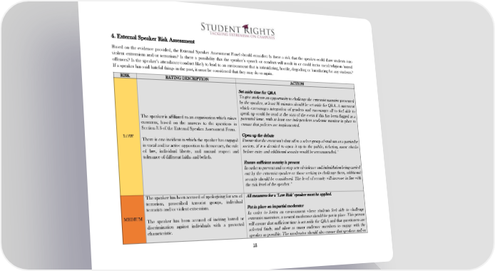 ! 4. External Speaker Risk Assessment Based on the evidence provided, the External Speaker Assessment Panel should consider: Is there a risk that the speaker could draw students into violent extremism and/or terrorism? Is there a possibility that the speaker’s speech or conduct will result in or could incite racial/religious hatred offences? Is the speaker’s attendance/conduct likely to lead to an environment that is intimidating, hostile, degrading or humiliating for any students? If a speaker has said hateful things in the past, it must be considered that they may do so again. RISK RATING DESCRIPTION ACTION Set aside time for Q&A To give students an opportunity to challenge the extremist narrative presented by the speaker, at least 30 minutes should be set aside for Q&A. A statement which encourages integration of genders and encourages all to feel able to speak up could be read at the start of the event if this has been flagged as a The speaker is affiliated to an organisation which raises potential issue, with at least one independent academic monitor in place to concerns, based on the answers to the questions in ensure that policies are implemented. Section 3.3 of the External Speaker Assessment Form. LOW Open up the debate There is one incident in which the speaker has engaged Ensure that the event isn’t shut off to a select group of students or a particular in vocal and/or active opposition to democracy, the rule society. If it is decided to open it up to the public, ticketing, name checks of law, individual liberty, and mutual respect and before entry and additional security would be recommended.* tolerance of different faiths and beliefs. Ensure sufficient security is present In order to prevent and/or stop acts of violence and intimidation being carried out by the extremist speaker or those seeking to challenge them, additional security should be considered. The level of security will increase in line with the risk level of the speaker.* The speaker has been accused of apologising for acts of All measures for a ‘Low Risk’ speaker must be applied. terrorism, proscribed terrorist groups, individual terrorists and/or violent extremism. Put in place an impartial moderator MEDIUM In order to foster an environment where students feel able to challenge The speaker has been accused of inciting hatred or extremist narratives, a neutral moderator should be put in place. This person discrimination against individuals with a protected will ensure that sufficient time is set aside for Q&A and that questioners are characteristic. selected fairly, and allow as many audience members to engage with the speaker as possible. The moderator should also ensure that speakers and/or 18! !