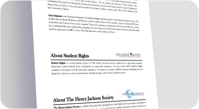 ! About the Authors Rupert Sutton is the Director of ‘Student Rights‘, and a Research Fellow at The Henry Jackson Society, where he focuses on domestic extremism and security issues. He has written for Haaretz, World Affairs, The Huffington Post and New Humanist and has presented his research at the British and European Parliaments. Rupert has an MA in Terrorism and Security from King’s College London and a BA in War Studies from the University of Kent. Gray Sergeant is the National Organiser for Student Rights and Researcher at the Henry Jackson Society. He studied International Relations and History at the London School of Economics. Prior to joining HJS, Gray worked for the Labour Party in the marginal Thurrock constituency during the 2015 General Election, where he coordinated the press and media campaign. He has written for Left Foot Forward, Progress and Labourlist and has appeared on BBC 5 Live, The Big Questions and Al Jazeera News. About Student Rights Student Rights is a non-partisan project of The Henry Jackson Society dedicated to supporting equality, democracy and freedom from extremism on university campuses. Set up in June 2009, Student Rights monitors extremism on UK university campuses - focusing on a range of different groups including, but not limited to, fascist or racist organisations, Islamist groups, and extreme political parties. About The Henry Jackson Society The Henry Jackson Society is a think tank and policy-shaping force that fights for the principles and alliances which keep societies free - working across borders and party lines to combat extremism, advance democracy and real human rights, and make a stand in an increasingly uncertain world. 23! !