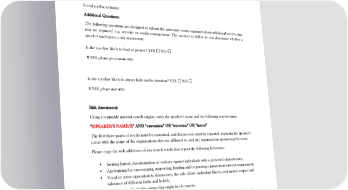 ! Speaker’s Details Name (including all names known by): Association: Other affiliations: Social media/websites: Additional Questions: The following questions are designed to inform the university events organiser about additional services that may be required, e.g. security or media management. The answers to follow do not determine whether a speaker undergoes a risk assessment. Is the speaker likely to lead to protest? YES □ NO □ If YES, please give reasons why: Is the speaker likely to attract high media attention? YES □ NO □ If YES, please state why: Risk Assessment: Using a reputable internet search engine, enter the speaker’s name and the following search terms: “[SPEAKER’S NAME/S]” AND “extremism” OR “terrorism” OR “hatred” The first three pages of results must be examined, and this process must be repeated, replacing the speaker’s name with the name of the organisations they are affiliated to, and any organisations sponsoring the event. Please copy the web addresses of any search results that report the following behaviour: •! Inciting hatred, discrimination or violence against individuals with a protected characteristic; •! Apologising for, encouraging, supporting, funding and/or praising a proscribed terrorist organisation; •! Vocal or active opposition to democracy, the rule of law, individual liberty, and mutual respect and tolerance of different faiths and beliefs; •! Any reports of a similar nature that might be of concern. The Approving Officer will take into account the credibility of the source and the evidence provided when reviewing any sources you provide. However, it is best to avoid fringe forums, websites making unsubstantiated claims and pieces stating personal opinion without providing evidence. Please attach below the website addresses or links to any reports that could be of concern. Please state which search engine you have used: 14! !