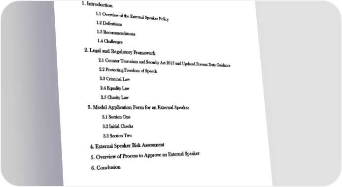 ! A Model External Speaker Policy: Assessing the Risks Posed by External Speakers On-campus Contents 1. Introduction 1.1 Overview of the External Speaker Policy 1.2 Definitions 1.3 Recommendations 1.4 Challenges 2. Legal and Regulatory Framework 2.1 Counter Terrorism and Security Act 2015 and Updated Prevent Duty Guidance 2.2 Protecting Freedom of Speech 2.3 Criminal Law 2.4 Equality Law 2.5 Charity Law 3. Model Application Form for an External Speaker 3.1 Section One 3.2 Initial Checks 3.3 Section Two 4. External Speaker Risk Assessment 5. Overview of Process to Approve an External Speaker 6. Conclusion 1! !