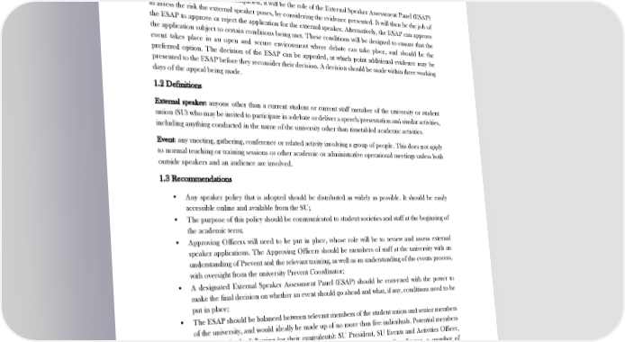 ! An Approving Officer will be responsible for reviewing the information provided in Section One. In the majority of cases, the process will not extend any further than this review and the event will proceed as planned. However, if concerns are raised at this stage, the Approving Officer must complete Section Two of the application. Once Section Two has been completed, it will be the role of the External Speaker Assessment Panel (ESAP) to assess the risk the external speaker poses, by considering the evidence presented. It will then be the job of the ESAP to approve or reject the application for the external speaker. Alternatively, the ESAP can approve the application subject to certain conditions being met. These conditions will be designed to ensure that the event takes place in an open and secure environment where debate can take place, and should be the preferred option. The decision of the ESAP can be appealed, at which point additional evidence may be presented to the ESAP before they reconsider their decision. A decision should be made within three working days of the appeal being made. 1.2 Definitions External speaker: anyone other than a current student or current staff member of the university or student union (SU) who may be invited to participate in a debate or deliver a speech/presentation and similar activities, including anything conducted in the name of the university other than timetabled academic activities. Event : any meeting, gathering, conference or related activity involving a group of people. This does not apply to normal teaching or training sessions or other academic or administrative operational meetings unless both outside speakers and an audience are involved. 1.3 Recommendations •! Any speaker policy that is adopted should be distributed as widely as possible. It should be easily accessible online and available from the SU; •! The purpose of this policy should be communicated to student societies and staff at the beginning of the academic term; •! Approving Officers will need to be put in place, whose role will be to review and assess external speaker applications. The Approving Officers should be members of staff at the university with an understanding of Prevent and the relevant training, as well as an understanding of the events process, with oversight from the university Prevent Coordinator; •! A designated External Speaker Assessment Panel (ESAP) should be convened with the power to make the final decision on whether an event should go ahead and what, if any, conditions need to be put in place; •! The ESAP should be balanced between relevant members of the student union and senior members of the university, and would ideally be made up of no more than five individuals. Potential members could include the following (or their equivalents): SU President, SU Events and Activities Officer, the university Equality and Diversity Officer, the university Prevent Coordinator, a member of university Facilities or Estates staff involved in room bookings or security for events, or any staff member with experience of relevant Prevent training; •! The decision of the ESAP does not need to be made at a formal meeting if it is not practical to do so, in which case it may be agreed through email contact. 3! !