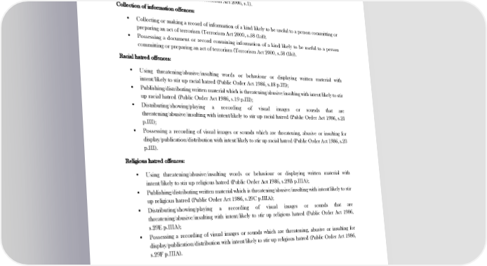 ! •! Possessing a terrorist publication with view to distribute/sell/loan/read/listen/see (Terrorism Act 2000, s.2 (1) (a) and (1) (f)). Encouragement of terrorism: •! Encouragement of terrorism (Terrorism Act 2006, s.1). Collection of information offences: •! Collecting or making a record of information of a kind likely to be useful to a person committing or preparing an act of terrorism (Terrorism Act 2000, s.58 (1a)); •! Possessing a document or record containing information of a kind likely to be useful to a person committing or preparing an act of terrorism (Terrorism Act 2000, s.58 (1b)). Racial hatred offences: •! Using threatening/abusive/insulting words or behaviour or displaying written material with intent/likely to stir up racial hatred (Public Order Act 1986, s.18 p.III); •! Publishing/distributing written material which is threatening/abusive/insulting with intent/likely to stir up racial hatred (Public Order Act 1986, s.19 p.III); •! Distributing/showing/playing a recording of visual images or sounds that are threatening/abusive/insulting with intent/likely to stir up racial hatred (Public Order Act 1986, s.21 p.III); •! Possessing a recording of visual images or sounds which are threatening, abusive or insulting for display/publication/distribution with intent/likely to stir up racial hatred (Public Order Act 1986, s.23 p.III). Religious hatred offences: •! Using threatening/abusive/insulting words or behaviour or displaying written material with intent/likely to stir up religious hatred (Public Order Act 1986, s.29B p.IIIA); •! Publishing/distributing written material which is threatening/abusive/insulting with intent/likely to stir up religious hatred (Public Order Act 1986, s.29C p.IIIA); •! Distributing/showing/playing a recording of visual images or sounds that are threatening/abusive/insulting with intent/likely to stir up religious hatred (Public Order Act 1986, s.29E p.IIIA); •! Possessing a recording of visual images or sounds which are threatening, abusive or insulting for display/publication/distribution with intent/likely to stir up religious hatred (Public Order Act 1986, s.29F p.IIIA). Harassment: •! Using threatening, abusive or insulting words or behaviour likely to cause harassment, alarm or distress (Public Order Act, s.5). There is an important distinction between inciting racial hatred and/or harassment offences and inciting religious hatred or incitement to hatred because of sexual orientation. In religious and sexual orientation cases 10! !