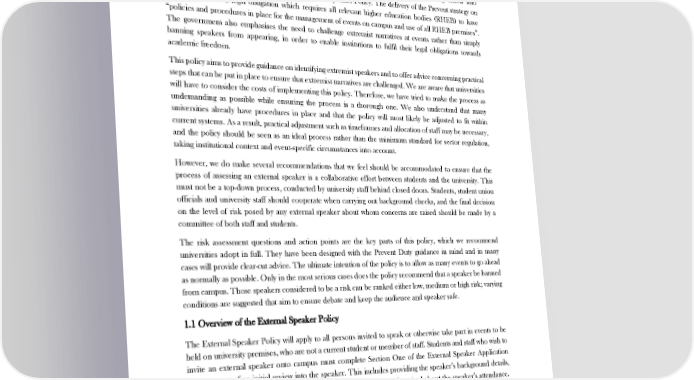 ! 1. Introduction In light of the provisions of the Counter Terrorism and Security Act 2015, which impose a duty on Higher Education institutions to have “due regard to the need to prevent individuals from being drawn into terrorism”, Student Rights has developed this Model Speaker Policy. The delivery of the Prevent strategy on campuses is now a legal obligation which requires all relevant higher education bodies (RHEB) to have “policies and procedures in place for the management of events on campus and use of all RHEB premises”. The government also emphasises the need to challenge extremist narratives at events rather than simply banning speakers from appearing, in order to enable institutions to fulfil their legal obligations towards academic freedom. This policy aims to provide guidance on identifying extremist speakers and to offer advice concerning practical steps that can be put in place to ensure that extremist narratives are challenged. We are aware that universities will have to consider the costs of implementing this policy. Therefore, we have tried to make the process as undemanding as possible while ensuring the process is a thorough one. We also understand that many universities already have procedures in place and that the policy will most likely be adjusted to fit within current systems. As a result, practical adjustment such as timeframes and allocation of staff may be necessary, and the policy should be seen as an ideal process rather than the minimum standard for sector regulation, taking institutional context and event-specific circumstances into account. However, we do make several recommendations that we feel should be accommodated to ensure that the process of assessing an external speaker is a collaborative effort between students and the university. This must not be a top-down process, conducted by university staff behind closed doors. Students, student union officials and university staff should cooperate when carrying out background checks, and the final decision on the level of risk posed by any external speaker about whom concerns are raised should be made by a committee of both staff and students. The risk assessment questions and action points are the key parts of this policy, which we recommend universities adopt in full. They have been designed with the Prevent Duty guidance in mind and in many cases will provide clear-cut advice. The ultimate intention of the policy is to allow as many events to go ahead as normally as possible. Only in the most serious cases does the policy recommend that a speaker be banned from campus. Those speakers considered to be a risk can be ranked either low, medium or high risk; varying conditions are suggested that aim to ensure debate and keep the audience and speaker safe. 1.1 Overview of the External Speaker Policy The External Speaker Policy will apply to all persons invited to speak or otherwise take part in events to be held on university premises, who are not a current student or member of staff. Students and staff who wish to invite an external speaker onto campus must complete Section One of the External Speaker Application Form as part of an initial review into the speaker. This includes providing the speaker’s background details, as well as a brief examination into any potential concerns that may be raised about the speaker’s attendance. The principal organiser will also be required to carry out a rigorous online search into the speaker and their affiliations, looking specifically at potential concerns surrounding issues of extremism, hate speech and terrorism. 2! !