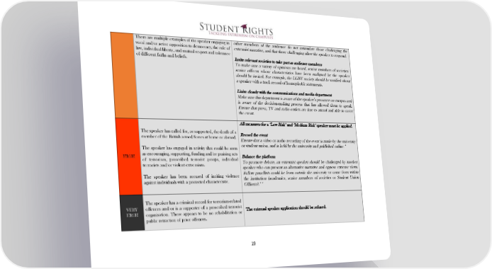 ! There are multiple examples of the speaker engaging in other members of the audience do not intimidate those challenging the vocal and/or active opposition to democracy, the rule of extremist narrative, and that those challenging allow the speaker to respond. law, individual liberty, and mutual respect and tolerance of different faiths and beliefs. Invite relevant societies to take part as audience members To make sure a variety of opinions are heard, senior members of societies/ senior officers whose characteristics have been maligned by the speaker should be invited. For example, the LGBT society should be notified about a speaker with a track record of homophobic statements. Liaise closely with the communications and media department Make sure this department is aware of the speaker’s presence on campus and is aware of the decision-making process that has allowed them to speak. Ensure that press, TV and radio outlets are free to attend and able to cover the event. All measures for a ‘Low Risk’ and ‘Medium Risk’ speaker must be applied. The speaker has called for, or supported, the death of a member of the British armed forces at home or abroad. Record the event Ensure that a video or audio recording of the event is made by the university The speaker has engaged in activity that could be seen or student union, and is held by the university and published online.* as encouraging, supporting, funding and/or praising acts HIGH of terrorism, proscribed terrorist groups, individual Balance the platform terrorists and/or violent extremism. To promote debate, an extremist speaker should be challenged by another speaker who can present an alternative narrative and oppose extreme views. The speaker has been accused of inciting violence Fellow panellists could be from outside the university or come from within against individuals with a protected characteristic. the institution (academics, senior members of societies or Student Union Officers).** The speaker has a criminal record for terrorism-related VERY offences and/or is a supporter of a proscribed terrorist The external speaker application should be refused. HIGH organisation. There appears to be no rehabilitation or public retraction of prior offences. 19! !