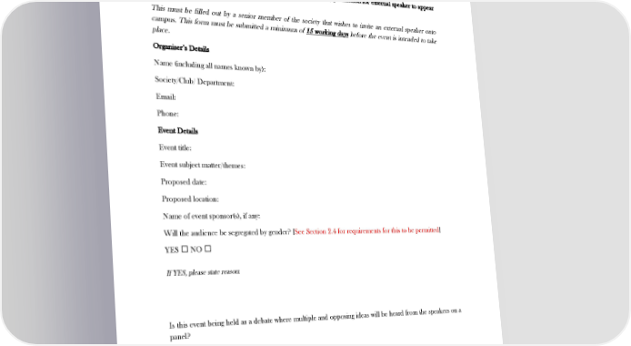 ! 3. Model Application Form for an External Speaker 3.1 Section One [To be filled out by the student society/member of staff requesting permission for external speaker to appear on campus.] This must be filled out by a senior member of the society that wishes to invite an external speaker onto 15 working days campus. This form must be submitted a minimum of before the event is intended to take place. Organiser’s Details Name (including all names known by): Society/Club/ Department: Email: Phone: Event Details Event title: Event subject matter/themes: Proposed date: Proposed location: Name of event sponsor(s), if any: Will the audience be segregated by gender? [See Section 2.4 for requirements for this to be permitted] YES □ NO □ If YES, please state reason: Is this event being held as a debate where multiple and opposing ideas will be heard from the speakers on a panel? YES □ NO □ If YES, please list the speakers that will appear alongside this speaker: 13! !