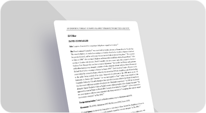 AN ENDURING THREAT: EUROPE’S ISLAMIST TERROR NETWORKS THEN AND NOW 2.8 Other DAVID COURTAILLER 1020 Role: Logistics. Convicted for conspiring to help those engaged in terrorism. Bio: 1021 French national Courtailler was raised with his brother, Jerome, in Bonneville in the French Alps. The son of a butcher, he studied accounting at a Catholic school before his father’s business failed and 1022 his parents divorced, and he and Jerome became involved with alcohol and drug abuse. He converted 1023 1024 to Islam in 1996 after moving to Brighton and being told it would help with his drug problems. After moving to London with Jerome, David Courtailler was given money and a fake passport by friends at 1025 Finsbury Park Mosque who sent him to train in Afghanistan. He travelled via Pakistan and spent time at Khalden training camp alongside a number of other al-Qaeda militants including Ahmed Ressam and 1026 Richard Reid before returning to Europe in August 1998. David stayed in Tangiers, Morocco on his return before he returned to France, where he was arrested in 1999 after shoplifting a pair of shoes leading to the police being notified of his return. Suspected of involvement in the 1998 attacks on the US 1027 1028 Embassies in Kenya and Tanzania, he was interrogated in Paris before being released on bail. Courtailler fled to the UK and is thought to have moved to Leicester, while his fake French driving license 1029 was discovered with large quantities of explosives in a Birmingham apartment. In 2000, he was arrested alongside Djamel Beghal in Calais as Beghal oversaw a kidnapping plot, before disappearing again.1030 He 1031 appeared in court in France in March 2004 “accused of recruiting for al-Qaeda” and was sentenced to two years in prison with two years suspended after being convicted of “conspiring with criminals engaged 1032 in a terrorist enterprise” in May 2004. Foreign training/combat: Trained at Khalden training camp in Afghanistan until 1998. Movements: UK (1996); Afghanistan (1997-98); Morocco (1998); France (1999). Criminal history: Involved with drugs prior to converting to Islam. Arrested for shoplifting in France in 1033 1034 1999. Convicted of “conspiring with criminals engaged in a terrorist enterprise” in May 2004. Known to the authorities: Courtailler was known to the authorities on his return from Afghanistan, with 1035 US intelligence notifying the French authorities he was travelling to Europe in August 1998. He was 1036 also detained in 1999 as part of an investigation into the 1998 US Embassy attacks. ! ! 1020 ‘Frenchman jailed for terror ties’, BBC News, 25 May 2004, available at: http://news.bbc.co.uk/1/hi/world/europe/3746951.stm, last visited: 9 August 2016. 1021 ‘Europe fears Islamic converts may give cover for extremism’, The New York Times, 19 July 2004. 1022 Rotella, S. and David Zucchino, ‘Embassy plot offers insight into terrorist recruitment, training’, The Chicago Tribune, 22 October 2001. 1023 ‘Europe fears Islamic converts may give cover for extremism’, The New York Times, 19 July 2004. 1024 Barnett, A. et al., ‘UK student's 'key terror role'’, Guardian, 28 October 2001. 1025 Norton-Taylor, R. and Rosie Cowan, ‘Madrid bomb suspect linked to UK extremists’, Guardian, 17 March 2004, available at: https://www.theguardian.com/world/2004/mar/17/spain.terrorism1, last visited: 9 August 2016. 1026 ‘Europe fears Islamic converts may give cover for extremism’, The New York Times, 19 July 2004. 1027 Barnett, A. et al., ‘UK student's 'key terror role'’, Guardian, 28 October 2001. 1028 ‘In Paris, a Frightening Look at Terror’s Inconspicuous Face; Probe: Officials say plot against U.S. Embassy offers insight into recruitment and training of ordinary young men’, Los Angeles Times, 21 October 2001, available at: http://articles.latimes.com/2001/oct/21/news/mn-59825/4, last visited: 9 August 2016. 1029 ‘Europe fears Islamic converts may give cover for extremism’, The New York Times, 19 July 2004. 1030 Sapsted, D., ‘Vet is convicted of kidnapping five children’, The Telegraph, 1 July 2005. 1031 ‘France puts 'Islamists' on trial’, BBC News, 17 March 2004, available at: http://news.bbc.co.uk/1/hi/world/europe/3520974.stm, last visited: 9 August 2016. 1032 ‘Frenchman jailed for terror ties’, BBC News, 25 May 2004. 1033 ‘Europe fears Islamic converts may give cover for extremism’, The New York Times, 19 July 2004. 1034 ‘Frenchman jailed for terror ties’, BBC News, 25 May 2004. 1035 ‘Europe fears Islamic converts may give cover for extremism’, The New York Times, 19 July 2004. 1036 ‘In Paris, a Frightening Look at Terror’s Inconspicuous Face; Probe: Officials say plot against U.S. Embassy offers insight into recruitment and training of ordinary young men’, Los Angeles Times, 21 October 2001. ! ! 82 !