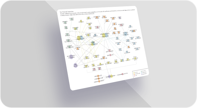 New Network Connections The links established between members of the networks behind the attacks targeting Paris on 13 November 2015 and Brussels on 22 March 2016, as well as between the Belgian networks responsible for recruiting extremists to fight in Syria and the Islamic State networks behind the plots. YOUSSEF LAZEZ NOUREDDINE KHALID AL-AJMI ABRAIMI ABRAIMI BEN LARBI SID AHMED FABIEN IBRAHIM ALI GHLAM CLAIN FARISI OULKADI SOFIANE MOHAMED AMGHAR SMAIL AMRI AYOUD EL FARISI MOMAMED HAMZA NICHOLAS KHAZZANI MOHAMMED ABRINI ATTOU MOREAU KHEMIR REDA SAMI OSAMA HAME ZARROUK KRAYEM MOMAMED SALAH BELKAID ABID ABDELHAMID RABAH YASSINE ABDERRAHMANE ABERKAN MENIKER ALAMI KHALID AMEROUD KHALID ABDESLAM ABAAOUD ZERKANI EL-BAKRAOUI REDA NAJIM KRIKET SOUFIANE YOUSSEF IBRAHIM LAACHRAOUI FATIMA ALILOU BOUYABAREM EL-BAKRAOUI ABERKAN SOUFIANE YONI PATRIC AYARI MAYNE MALIKA EL AROUD HASNA ANIS ABU SULEYMAN AITBOULAHCEN GELEL BAHRI AL-FARANSI ATTAR ABDELHOUAID AHMED MOMAMMED ILIAS ABERKAN DAHMANI BAKKALI MEHDI ABDOULLAH C MOHAMMADI NEMMOUCHE AMR AL-ABSI BRAHIM BILAL AHMAD OMAR CHAKIB SAMI FOUED M ISMAIL MOHAMMED ABDESLAM HADFI AL-MAHMOD AL-MOHAMED MOSTEFAI AKROUH AMIMOUR AGGAD SAMIR PIERRE ZARIOH NDJEKA SAID KOUACHI CHERIF KOUACHI SALIM BENGHALEM MOHAMED EL-AYOUNI Paris Attack Brussels Attack AHMEDY COULIBALY Other Plots & Attacks Zerkani Network Other Islamic State (IS)