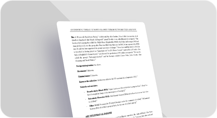 AN ENDURING THREAT: EUROPE’S ISLAMIST TERROR NETWORKS THEN AND NOW Bio: 514 A 36-year-old Saudi-born Syrian, al-Absi and his older brother, Firas al-Absi (an associate of al- 515 516 Qaeda in Iraq head Abu Musab Al-Zaqarwi) joined IS while it was still affiliated with al-Qaeda. The brothers led a group they called the Majlis Shura Mujadeddin (MSM) which they had set up in 2012 and Amr al-Absi took over the group after Firas was killed later that year. In 2013, he incorporated the MSM 517 into IS and was later appointed the group’s governor of Aleppo. From then until his death in 2016, he is described as having played an “important role” in IS’s Shura Council,518 potentially as IS leader Abu 519 520 Bakr al-Baghdadi’s Syrian deputy, and directed the production of IS’s online propaganda. He was also called the group’s “kidnapper-in-chief” and his hostages included James Foley, John Cantlie, Alan 521 Henning and David Haines. Foreign training/combat: See above. Movements: Unknown. Criminal history: Unknown. Known to the authorities: 522 Al-Absi was added to the UN sanctions list in September 2015. Networks and associates: Brussels attacks (March 2016): 523 -! Najim Laachraoui [Part of al-Absi’s group in Syria; alleged to 524 have been put in charge of the interrogation of hostages]. -! Paris attacks (November 2015): Abdelhamid Abaaoud [Believed to have been at one time close 525 to al-Absi]. Other: 526 -! Mehdi Nemmouche [Tortured hostages under the command of al-Absi]; Mohammed Emwazi [Part of al-Absi’s group in Syria, he was one of al-Absi’s jailers].527 ABU SULEYMAN AL-FARANSI Role: Alleged to be a director of IS’s external intelligence operation, the Amn al-Kharji, it has been 528 suggested al-Faransi may have “conceived and planned” the Paris attacks, and may have also seen and 529 approved the Brussels attack plans. ! ! 514 Bacchi, U., ‘Isis: Islamic State kidnapper-in-chief Amr al-Absi 'killed in Aleppo', International Business Times, 4 March 2016, available at: http://www.ibtimes.co.uk/isis-islamic-state-kidnapper-chief-amr-al-absi-killed-aleppo-1547638, last visited: 9 August 2016. 515 Spencer, R., ‘Four jihadists, one prison: all released by Assad and all now dead’, The Telegraph, 11 May 2016. 516 Bacchi, U., ‘Isis: Islamic State kidnapper-in-chief Amr al-Absi 'killed in Aleppo', International Business Times, 4 March 2016. 517 ibid. 518 Barrett, R., ‘The Islamic State’, The Soufan Group, November 2014, available at: http://soufangroup.com/wp-content/uploads/2014/10/TSG-The-Islamic-State- Nov14.pdf, last visited: 9 August 2016, pp. 52, 30. 519 ‘An Account of Abu Bakr al-Baghdadi & Islamic State Succession Lines’, Aymenn Jawad Al-Tamimi, 24 January 2016, available at: http://www.aymennjawad.org/2016/01/an-account-of-abu-bakr-al-baghdadi-islamic-state, last visited: 9 August 2016. 520 Bacchi, U., ‘Isis: Islamic State kidnapper-in-chief Amr al-Absi 'killed in Aleppo', International Business Times, 4 March 2016. 521 Spencer, R., ‘Four jihadists, one prison: all released by Assad and all now dead’, The Telegraph, 11 May 2016. 522 Bacchi, U., ‘Isis: Islamic State kidnapper-in-chief Amr al-Absi 'killed in Aleppo', International Business Times, 4 March 2016. 523 Spencer, R., ‘Four jihadists, one prison: all released by Assad and all now dead’, The Telegraph, 11 May 2016. 524 ‘Brussels bomber Laachraoui was hostage gaoler in Syria – lawyer’, Reuters, 22 April 2016, available at: http://uk.reuters.com/article/uk-europe-attacks-syria- idUKKCN0XJ1FU, last visited: 9 August 2016. 525 Spencer, R., ‘Four jihadists, one prison: all released by Assad and all now dead’, The Telegraph, 11 May 2016. 526 ‘Masterminds of Terror’, Raconteur, May 2016, available at: http://raconteur.net/magazine/masterminds-of-terror, last visited: 9 August 2016. 527 Spencer, R., ‘Four jihadists, one prison: all released by Assad and all now dead’, The Telegraph, 11 May 2016. 528 Weiss, M., ‘Is This Frenchman Running ISIS Terror Networks in the West?’, The Daily Beast, 2 May 2016. 529 Gartenstein-Ross, D. and Nathaniel Barr, ‘Recent Attacks Illuminate Islamic State’s Europe Attack Network’, The Jamestown Foundation, 27 April 2016. ! ! 45 !