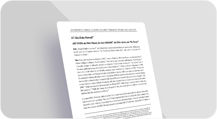 AN ENDURING THREAT: EUROPE’S ISLAMIST TERROR NETWORKS THEN AND NOW 966 2.7 Abu Doha Network 967 968 ABU DOHA aka Hider Hanani, aka Amar Makhlulif, aka Didier Ajuelos, aka ‘The Doctor’ Role: 969 Al-Qaeda-linked recruiter and alleged plot mastermind and financier linked to the ‘Millennium 970 971 bomb’ plot at Los Angeles Airport; the Strasbourg Market bomb plot; and a plot to bomb the US 972 Embassy in Rome. Bio: 973 974 Doha, who was born in Algeria in 1963, came to Britain in 1994 from France and claimed asylum 975 976 before settling in Islington, North London, where he became associated with Finsbury Park Mosque. 977 Using the mosque, he allegedly operated as al-Qaeda’s “chief recruiter in Europe” and created “one of 978 the most significant groups of terrorists in the United Kingdom”. Doha travelled to Afghanistan in 1996, 979 where he is said helped to run Khalden training camp, established by al-Qaeda in 1998. During this 980 time it is claimed he met Osama bin Laden in Kandahar to discuss collaboration between their networks. 981 He returned to Britain after three years, and in June 2000 his application for asylum was rejected. During 982 this time he is alleged to have conspired with Ahmed Ressam to bomb LAX airport in Los Angeles and to have been in contact with the Strasbourg cell, who contacted him to request more fund in December 983 984 2000. Doha was arrested and imprisoned in March 2001 while trying to travel to Saudi Arabia on a 985 false passport. While the charges were dropped in May, he continued to be held over accusations he 986 had breached his admission conditions. In August 2001, Doha was indicted in the US in connection with Ressam’s plot after Ressam claimed he had overseen the operation. Once the US had requested that Doha be extradited, other countries who claimed to have evidence connecting him to terror plots including France, Grammy and Italy dropped their own requests. In 2003, Ressam stopped cooperating with US authorities, leading the US charges to ! ! 966 We cite the existence of this network after drawing together information from multiple law enforcement and journalistic sources, including a British judge who said Doha had developed “one of the most significant groups of terrorists in the United Kingdom” (see O’Neill, S., ‘Immigration powers used to hold al-Qaeda kingpin in jail’, The Times, 20 October 2006), a former head of the Direction de la Surveillance du Territoire (DST) who said Doha was “al-Qaeda’s main recruiting sergeant in Europe”, and the journalists Sean O’Neill and Daniel McGrory, who have described Doha as “the ‘principle catalyst’ in setting up a network of North African Islamist terrorists in the UK” (see O’Neill, S. and Daniel McGrory, The Suicide Factory: Abu Hamza and the Finsbury Park Mosque (London: Harper Collins, 2006), pg. 116). 967 ‘Terror suspect held for seven years without charge in British prison’, Birmingham Mail, 3 January 2009, available at: http://www.birminghammail.co.uk/news/local-news/terror-suspect-held-for-seven-years-237565, last visited: 9 August 2016. 968 Meyer, J., ‘Alleged Mastermind in LAX Bomb Plot Indicted’, Los Angeles Times, 29 August 2001, available at: http://articles.latimes.com/2001/aug/29/news/mn-39692, last visited: 9 August 2016. 969 Crumley, B., ‘The Terror Suspect Who May Go Free’, Time, 30 October 2006, available at: http://content.time.com/time/world/article/0,8599,1552218,00.html, last visited: 9 August 2016. 970 Meyer, J., ‘Alleged Mastermind in LAX Bomb Plot Indicted’, Los Angeles Times, 29 August 2001. 971 Crewdson, J., ‘Germany sends 4 to prison in New Year's plot’, Chicago Tribune, 11 March 2003, available at: http://articles.chicagotribune.com/2003-03- 11/news/0303110303_1_al-qaeda-bombing-plot-terror-network, last visited: 9 August 2016. 972 Lashmar, P., ‘Ricin 'made for use in random killing spree', Independent, 12 January 2003, available at: http://www.independent.co.uk/news/uk/crime/ricin-made- for-use-in-random-killing-spree-123981.html, last visited: 9 August 2016. 973 Burns, J., ‘2nd Terror Suspect Released in Britain’, International New York Times, 4 July 2008. 974 Gardham, D., ‘Terrorist 'linked to Osama bin Laden' released on bail’, The Telegraph, 3 July 2008, available at: http://www.telegraph.co.uk/news/uknews/2240804/Terrorist-linked-to-Osama-bin-Laden-released-on-bail.html, last visited: 9 August 2016. 975 O’Neill, S., ‘Immigration powers used to hold al-Qaeda kingpin in jail’, The Times, 20 October 2006, available at: http://www.thetimes.co.uk/tto/news/uk/crime/article1876009.ece, last visited: 9 August 2016. 976 Burrell, I. and John Lichfield, ‘Warning signs of Algerian terror cells as early as 1994’, Independent, 16 January 2003; and O’Neill, S., ‘Immigration powers used to hold al-Qaeda kingpin in jail’, The Times, 20 October 2006. 977 Norton-Taylor, R., ‘Algerian detainee deported to France for alleged terror links’, Guardian, 16 September 2006, available at: http://www.theguardian.com/uk/2006/sep/16/france.politics, last visited: 9 August 2016. 978 O’Neill, S., ‘Immigration powers used to hold al-Qaeda kingpin in jail’, The Times, 20 October 2006. 979 Gardham, D., ‘Terrorist 'linked to Osama bin Laden', released on bail’, The Telegraph, 3 July 2008. 980 Hooper, J., ‘Al-Qaida cell in UK 'planned attack'’, Guardian, 26 October 2001, available at: https://www.theguardian.com/uk/2001/oct/26/afghanistan.world1, last visited: 9 August 2016. 981 Gardham, D., ‘Terrorist 'linked to Osama bin Laden', released on bail’, The Telegraph, 3 July 2008. 982 Meyer, J., ‘Alleged Mastermind in LAX Bomb Plot Indicted’, Los Angeles Times, 29 August 2001. 983 Crewdson, J., ‘Germany sends 4 to prison in New Year's plot’, Chicago Tribune, 11 March 2003. 984 Anonymised SIAC judgement, available on request. 985 Burns, J., ‘2nd Terror Suspect Released in Britain’, 