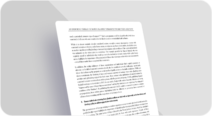 AN ENDURING THREAT: EUROPE’S ISLAMIST TERROR NETWORKS THEN AND NOW 1356 need a particularly intensive type of support”. Such a programme could be adapted to deal with those convicted of offences who are considered to be likely to seek to recruit individuals in future. While it is almost certainly already considered serious enough to ensure investigation, contact with convicted terrorists on licence, under house arrest, or subject to any form of civil orders, should also serve as another significant red flag leading to increased investigation and surveillance if the convicted individual was unknown to the visitor prior to conviction. The example provided by Djamel Beghal, who was regularly visited by individuals who would go on to be involved in terrorist attacks while under house arrest, highlights the importance of keeping track of those who visit major nodes within terrorist networks – even if those nodes have completed their sentences. In addition, the malign influence of those organisations and individuals which regularly promote or advocate on behalf of convicted terrorists should also be considered as worth challenging – particularly where this is done on the property or social media of public sector or charitable institutions. While not direct recruitment, the lionising of men and women convicted of serious crimes risks glorifying their activities and galvanising support for their cause. More serious is the publication of material written by convicted terrorist recruiters from within prison, with the pro-terrorist group, CAGE, publishing Djamel Beghal’s writings on its website in 2013. In one article, Beghal tells readers that other Muslims are being “imprisoned because of their religious convictions” and that the disbelievers are exploiting “the subjugated condition of the Muslims”. By publishing this material, CAGE enabled a convicted terrorist to continue propagandising from within prison, highlighting both the difficulty in preventing those convicted of offences from recruiting and the importance of seeking to do so. 3. Ensure individuals returning from jihadist conflicts are dealt with as rigorously as the law allows, and ! develop policy to address gaps in law enforcement; The pervasiveness of foreign training or combat experience across terrorists involved in both networks profiled in this report highlights the importance of identifying the threat posed by fighters returning from jihadist conflicts. The same is true of data collected by the Henry Jackson Society, which has identified the central role played within serious bomb plots by those with such experience. Outside of these networks, those responsible for a number of recent terrorist attacks have also sought such training, with Larossi Abballa, responsible for killing French police commander Jean-Baptiste Salvaing and his wife in June 2016, having been previously convicted for his role in a recruitment network “linked to Pakistan and 1357 Afghanistan”. Meanwhile, Adel Kermiche, who killed Father Jacques Hamel in July 2016 was reported 1358 to have been electronically tagged after seeking to enter Syria twice in 2015. While there has been considerable focus on the foreign fighter phenomenon since the extent to which individuals had begun travelling to the country became apparent in 2012, it is clear that the threat posed was underestimated. Some academics suggested it could be argued “Syria’s foreign fighters are less of a danger than is often supposed” and wrote that “hounding them with the threat of arrest or otherwise ! ! 1356‘The United Kingdom’s Strategy for Countering Terrorism: Annual Report for 2015’, HM Government, July 2016, available at: https://www.gov.uk/government/uploads/system/uploads/attachment_data/file/539683/55469_Cm_9310_Web_Accessible_v0.11.pdf, last visited: 9 August 2016, p. 16. 1357 ‘French police chief and partner killed in stabbing claimed by Isis’, Guardian, 14 June 2016, available at: https://www.theguardian.com/world/2016/jun/13/french-policeman-stabbed-death-paris, last visited: 9 August 2016. 1358 ‘French priest’s killer was freed from jail despite aiming to join jihadis’, Guardian, 27 July 2016, available at: https://www.theguardian.com/world/2016/jul/27/teenager-who-murdered-french-priest-was-like-a-ticking-time-bomb, last visited: 9 August 2016. ! ! 109 !