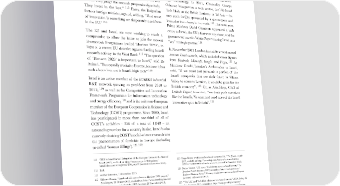 HJS Friends of Israel Report FINAL_HJS Friends of Israel Report FINAL.qxd 06/02/2014 09:55 Page 17 ADDED VALUE: ISRAEL’S STRATEGIC WORTH TO THE EU AND ITS MEMBER STATES Moreover, among 289 research projects approved by Britain and Israel: High tech the European Research Council in 2013, 32 – a Britain-Israel bilateral trade was £3.75 billion in 2012, staggering 11% – went to young Israeli scientists, or 34% higher than the previous year.123124 Much of behind only the United Kingdom and Germany.114 As Hebrew University’s Prof. Isaiah Arkin remarked, that growth is now concentrated in one critical field: “The Europeans aren’t doing Israeli researchers any high technology. In 2011, Chancellor George favour. They judge the research proposals objectively. Osborne inaugurated a tech centre, the UK-Israel They invest in the best.” 115 Passy, the Bulgarian Tech Hub, at the British Embassy in Tel Aviv – the reign minister, agreed, adding, “That sense only such facility sponsored by a government and former fo 125 That same year, of innovation is something we desperately need here located at its embassy, in the world. in the EU.”116 Prime Minister David Cameron appointed a tech envoy to Israel, the UK’s first-ever anywhere, and the The EU and Israel are now working to reach a government issued a White Paper naming Israel as a compromise to allow the latter to join the newest “key” strategic partner.126 Framework Programme (called ‘Horizon 2020’), in In November 2013, London hosted its second annual light of a recent EU directive against funding Israeli Innovate Israel summit, which included senior figures research activity in the West Bank.117 “The question of ‘Horizon 2020’ is important to Israel,” said Dr from Facebook; Microsoft; Google; and Virgin. 127 As Avineri. “But equally crucial to Europe, because it has Matthew Gould, London’s Ambassador to Israel, such a keen interest in Israeli high tech.”118 said, “If we could just persuade a portion of the Israeli companies that see their future in Silicon Israel is an active member of the EUREKA industrial Valley to come to London, it would be great for the R&D network (serving as president from 2010 to British economy”. 128 Or, as Alex Hoye, CEO of 2011),119 as well as the Competitive and Innovation Latitude Digital, lamented, “we don’t push ourselves Framework Programme for information technology like the Israelis. We want and need more of the Israeli and energy efficiency,120 and is the only non-European innovative spirit in Britain”.129 member of the European Cooperation in Science and Technology (COST) programme. Since 2000, Israel has participated in more than one-third of all of COST’s activities – 356 of a total of 1,048 – an astounding number for a country its size. Israel is also currently chairing COST’s social-science research into the phenomenon of femicide in Europe (including so-called ‘honour killings’).121 122 114 “RDI in Israel News,” Delegation of the European Union to the State of 123 Hugo Bieber, “I will boost Israel trade across the UK,” The JC.com, 14 July Israel (2013), available at: http://eeas.europa.eu/delegations/ 2013, available at: http://www.thejc.com/business/business-features/ israel/documents/eu_israel/290_en.pdf (accessed 5 November 2013). 109454/i-will 115 Ibid. -boost-israel-trade-across-uk (accessed 16 December 2013). 116 Author interview, 11 December 2013. 124 Nadav Shemer, “UK envoy: Trade boom proves no Israel boycott,” The Jerusalem Post, 29 February 2012, available at: http://www.jpost.com/ 117 Shlomo Cesana, “Israel and EU move closer on Horizon 2020 project,” Business/Business-News/UK-envoy-Trade-boom-proves-no-Israel-boycott Israel Hayom, 24 October 2013, available at: http://www.israelhayom.com/ (accessed 16 December 2013). site/newsletter_article.php?id=12809 (accessed 20 November 2013). 125 “The UK Israel Tech Hub celebrates two years of success,” British Embassy Tel 118 Author interview, 20 November 2013. Aviv, 7 October 2013, availab : https://www.gov.uk/government/ le at 119 “Eureka Member > Israel,” ka, available at: world-location-news/the-uk-israel-tech-hub-celebrates-two-years-of-success Eure (accessed 10 November 2013). http://www.eurekanetwork.org/israel/about (accessed 10 November 2013). 120 “Competitiveness and Innovation Framework Programme (CIP),” European 126 “Trading with Israel,” UK Israel Business, available at: Commission, 8 November 2013, available at: http://www.ukisraelbusiness.co.uk/?page_id=104 (accessed 29 October 2013). http://ec.europa.eu/cip/index_en.htm (accessed 10 November 2013). 127 “Innovate Israel,” Innovate Israel, available at: 121 “European Cooperation in Science and Technology (COST),” Weizmann http://innovateisrael.evolero.com/ (accessed 23 December 2013). Institute of Science, 16 June 2013, available at: http://www.we 128 David Sham izmann.ac.il/ ah, “High-tech diplomacy puts Israel and UK on the same RGP_open/postdoc/EU-COST.html (accessed 2 November 2013). page,” The Times of Israel, 30 October 2012, available at: 122 “Femicide across Europe,” European Cooperation in Science and Technology, http://www.timesofisrael.com/high-tech-diplomacy-puts-israel-and-uk- available at: http://www.cost.eu/domains_actions/isch/Actions/IS1206 on-the-same-page/ (accessed 5 November 2013). (accessed 2 December 2013). 129 Ibid. 15