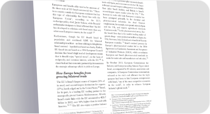 HJS Friends of Israel Report FINAL_HJS Friends of Israel Report FINAL.qxd 06/02/2014 09:55 Page 13 ADDED VALUE: ISRAEL’S STRATEGIC WORTH TO THE EU AND ITS MEMBER STATES of trade with Israel, amounting to €4.3 billion in The Economic 2011. Some 84% of EU exports to the Jewish state are in its crucial manufacturing sector – half of them in Dimension the subset of machinery and transport equipment.72 Over the past year, a particular spike was seen in Israel’s Overview trade with Spain, and even more so with the UK. Israel is Britain’s second-largest trading partner in the Middle Europeans and Israelis alike tend to be unaware of East (after Saudi Arabia), and Britain is Israel’s the sheer scale of EU-Israel commercial ties. “There second-largest export market (after the US). 73 The is no country outside the European continent that has increase in trade with both European countries has this type of relationship that Israel has with the been prompted primarily by the chemical and ph European Union”, according to the EU’s armaceutical industries: the Israel Chemicals ex-foreign-policy chief, Javier Solana, while Brussels’ conglomerate, for example, owns potash mines in Spain ambassador-designate to Israel affirmed that “the EU and the UK, and exports agricultural chemicals has developed its relations with Israel more than any Continent-wide.74In the pharmaceutical arena, Teva– other non-European country in the world”.67 the Israeli firm that is the world’s leading maker of generic drugs – owns production facilities in Spain; the Furthermore, though the EU dwarfs Israel in UK; Germany; Italy; Ireland; and a handful of Eastern population and combined GDP, the bilateral European countries. 75 Israel’s outsized presence in relationship is neither – as those wishing to delegitimize Europe’s pharmaceutical market led to the 2010 Israel contend – lopsided nor based on charity. Rather, Agreement on Conformity Assessment and Acceptance EU-Israel ties are based on a 1994 European Council of Industrial Products (AACA), which co-ordinates decision that Israel’s high level of development means European and Israeli pharmaceutical standards (to that it should enjoy “special status”, on the basis of make for easier sale and manufacture on both sides).76 reciprocity and common interest, with the EU.68 A closer look at that economic partnership demonstrates In October 2013, European Commissioner for the strategic advantage which it yields to Europe. Industry and Entrepreneurship Antonio Tajani visited Israel, accompanied by 65 industry associations and c How Europe benefits from ompanies. A European Commission memorandum growing bilateral trade released at the visit’s end affirmed that the trip’s purpose had been to link European entrepreneurs The EU is Israel’s largest source of imports (35% of with Israel, “one of the most competitive economies its total) and second-largest destination for exports in the world”, in order to enhance European (27%), barely edged out by the United States.69 Israel, industry’s global reach.77 for its part, is a leading EU trading partner in the strategically pivotal Eastern Mediterranean. All told, opm http://www.export.gov.il/uploadfiles/09_2013/devel entsandtrendsin Israel’s trade links with the EU amounted to €29.7 israeliexport_summaryoffirsthalf2013.pdf (accessed 4 November 2013). billion in 2012, over 50% higher than its total with 72 “European Union, Trade in goods with Israel,” European Commission (2013), available at: America.70 71 The EU also enjoys a positive balance http://trade.ec.europa.eu/doclib/docs/2006/september/tradoc_113402.pdf. 73 Lord Green, “Seeing for myself what has made Israel the genuine Start-Up Nation,” The JC.com, 15 March 2013, available at: http://www.thejc.com/ d-debate/analysis/103387/seeing-myself-what-has-made- 67 Lars Faaborg-Andersen, “Delegitimizing Europe?,” The Jerusalem Post, 13 comment-an israel-genuine-start-up-nation-0 (accessed 17 December 2013). November 2013, available at: http://www.jpost.com/Opinion/Op-Ed- 74 “Israel Chemicals Ltd,” Bloomberg Businessweek, available at: ntributors/Delegitimizing-Europe-331654 (accessed 18 November 2013). Co http://investing.businessweek.com/research/stocks/snapshot/snapshot_ 68 “ENP Progress Report – Israel,” EUR-Lex, 4 December 2006, available at: article.asp?ticker=ICL:IT (accessed 11 December 2013). http://eur-lex.europa.eu/LexUriServ/LexUriServ.do?uri=SEC:2006: 75 “Trade,” Delegation of the European Union to Israel, available at: 1507:FIN:EN:HTML (accessed 4 November 2013). http://eeas.europa.eu/delegations/israel/eu_israel/trade_relation/ 69 “European Union, Trade in goods with Israel,” European Commission index_en.htm (accessed 5 November 2013). (2013), available at: http://trade.ec.europa.eu/doclib/docs/2006/ 76 “European Parliament approves EU-Israel agreement to simplify trade,” 113402.pdf, p. 9. september/tradoc_ Delegation of the European Union to Israel, 25 October 2012, available 70 “Countries and regions – Israel,” European Commission, 3 May 2013, available at: http://eeas.europa.eu/delegations/israel/press_corner/ at: http://ec.europa.eu/trade/policy/countries-and-regions/countries/israel/ all_news/news/2012/20121025_en.htm (accessed 23 December 2013). (accessed 29 October 2013). 77 “Building on long-standing ties, EU and Israel explore new oppo rtun ities for 71 “Developments and Trends in Israeli Exports: Summary of First Half 2013,” growth and innovation,” Europa, 21 October 2013, available at: http://europa.eu/ The Israel Export & International Cooperation Institute (2013), available at: rapid/press-release_MEMO-13-912_en.htm (accessed 29 October 2013). 11