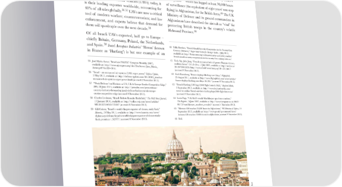 HJS Friends of Israel Report FINAL_HJS Friends of Israel Report FINAL.qxd 06/02/2014 09:55 Page 12 ADDED VALUE: ISRAEL’S STRATEGIC WORTH TO THE EU AND ITS MEMBER STATES be strengthened […] The West cannot fight this Israeli UAV that has saved the lives of European radical tide without Israel.”55 troops,60 contributing extensively to French military operations in Afghanistan;61 Libya;62 and Mali.63 UAV technology Another is the ‘Hermes 450’, developed by Israel’s In the 1970s, Israel became the first country ever to Elbit Systems 64 which has logged at least 70,000 hours produce Unmanned Aerial Vehicles (UAVs); today, it of surveillance (the equivalent of eight years’ non-stop is their leading exporter worldwide, accounting for flying) in Afghanistan, for the British Army.65 The UK 40% of all sales globally.56 57 UAVs are now a critical Ministry of Defence and its ground commanders in tool of modern warfare; counterterrorism; and law Afghanistan have described the aircraft as “vital” for enforcement, and experts believe that demand for protecting British troops in the country’s volatile them will quadruple over the next decade.58 Helmand Province.66 Of all Israeli UAVs exported, half go to Europe – chiefly Britain, Germany, Poland, the Netherlands, and Spain.59 Israel Aerospace Industries’ ‘Heron’ (known 60 Tsilla Hershco, “French-Israeli Security Cooperation in the Twenty-First Century (Hebrew),” Begin-Sadat Center for Strategic Studies, 1 July 2013, in France as ‘Harfang’) is but one example of an available at: http://besacenter.org/mideast-security-and-policy-studies/ french-israeli-security-cooperation-in-the-twenty-first-century-hebrew/. 61 Tech. Sgt. John Jung, “French unmanned aircraft protect Bagram Airmen, coalition forces” U.S. Air Force, 13 July 2009, available at: h //archive.is/ 55 José María Aznar, “Israel and NATO,” Congress Monthly (2007), ttp: available at: http://www.ajcongress.org/site/DocServer/Jose_Maria_ 20120720012659/http://www.af.mil/news/story.asp?id=123158417 Aznar.pdf?docID=3041. (accessed 9 November 2013). 56 “Israel – an unmanned air systems (UAS) super power,” Defense Update, 62 Zach Rosenberg, “France deploys Harfang over Libya,” Flightglobal, 3 May 2013, avail e at: http://defense-update.com/20130503_israel-as- 25 August 2011, available at: http://www.flightglobal.com/news/articles/ abl unmanned-air-systems-super-power.html (accessed 2 November 2013). france-deploys-harfang-over-libya-361301/ (accessed 9 November 2013). 57 “‘Peak Defence’ on Horizon as US, UK & Europe Erodes Competitive Edge,” 63 “French Harfang UAV logs 2,000 flight hours in Mali,” Shephard Media, 5 September 201 lable at: http://www.shephardmedia.com/ IHS, 24 June 2013, available at: http://press.ihs.com/press-release/ 3, avai country-industry-forecasting/peak-defence-horizon-us-uk-europe- news/uv-online/french-air-force-harfang-logs-2000-flight-hours-ma/ erodes-competitive-edge (accessed 9 November 2013). (accessed 9 November 2013). 58 Charles Levinson, “Israe bots Remake Battlefield,” The Wall Street Journal, 64 Lewis Page, “UK MoD reveals Watchkeeper spy-drone numbers,” li Ro 13 January 2010, available at: http://online.wsj.com/news/articles/ The Register, 15 June 2007, available at: http://www.theregister.co.uk/2007/ SB126325146524725387 (accessed 8 November 2013). 06/15/watchkeeper_numbers_revealed/ (accessed 4 November 2013). 65 “Hermes 450 reaches 70,000 hours in Afghanistan,” UK Minist 59 Gili Cohen, “Israel is world’s largest exporter of drones, study finds,” ry of Defence, 19 Haaretz, 19 May 2013, available at: http://www.haaretz.com/news/ September 2013, available at: https://www.gov.uk/government/news/ diplomacy-defense/israel-is-world-s-largest-exporter-of-drones-study- hermes-450-reaches-70000-hours-in-afghanistan (accessed 9 November 2013). finds.premium-1.524771 66 Ibid. (accessed 8 November 2013). terLu s .com/Ma iStock © The Vatican – a European icon secured by Israeli technology 10