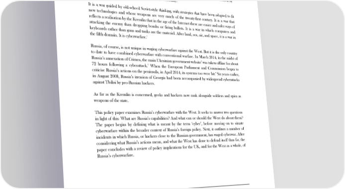 PUTIN’S CYBERWAR 1. Introduction Russia is at war with the West. Not only in a conventional sense, although given the Kremlin’s brazen acts over the last decade – the murder of Alexander Litvinenko in 2006, the invasion of Georgia in 2008, the annexation of Crimea in 2014 and the destabilisation of Ukraine since 2014 – you could be forgiven for thinking otherwise. Russia is also waging a covert war, characterised by scarcely believable, but nevertheless plausible, deniability. It is a war guided by old-school Soviet-style thinking, with strategies that have been adopted to fit new technologies and whose weapons are very much of the twenty-first century. It is a war that reflects a realisation by the Kremlin that in the age of the Internet there are easier and safer ways of attacking the enemy than dropping bombs or firing bullets. It is a war in which computers and keyboards rather than guns and tanks are the materiel. After land, sea, air, and space, it is a war in the fifth domain. It is cyberwarfare.1 Russia, of course, is not unique in waging cyberwarfare against the West. But it is the only country to date to have combined cyberwarfare with conventional warfare. In March 2014, in the midst of 2 Russia’s annexation of Crimea, the main Ukrainian government website was taken offline for about 72 hours following a cyberattack.3 When the European Parliament and Commission began to 4 criticise Russia’s actions on the peninsula, in April 2014, its systems too were hit. Six years earlier, in August 2008, Russia’s invasion of Georgia had been accompanied by widespread cyberattacks against Tbilisi by pro-Russian hackers. As far as the Kremlin is concerned, geeks and hackers now rank alongside soldiers and spies as weapons of the state. This policy paper examines Russia’s cyberwarfare with the West. It seeks to answer two questions in light of this: What are Russia’s capabilities? And what can or should the West do about them? The paper begins by defining what is meant by the term ‘cyber’, before moving on to situate cyberwarfare within the broader context of Russia’s foreign policy. Next, it outlines a number of incidents in which Russia, or hackers close to the Russian government, has waged cyberwar. After considering what Russia’s actions mean, and what the West has done to defend itself thus far, the paper concludes with a review of policy implications for the UK, and for the West as a whole, of Russia’s cyberwarfare. 1 It is not just the West that is targeted, either; the Kremlin’s domestic enemies have also been hit. On the day of Russia’s 2011 parliamentary election, for example, coordinated cyberattacks crashed the websites of many of the country’s liberal media outlets. Internet trolls have reportedly been paid to smear the opposition leader Alexey Navalny. See, Soldatov, A. and Irina Borogan, The Red Web: The Struggle Between Russia’s Digital Dictators and The New Online Revolutionaries (Public Affairs; New York, 2015). 2 The website is www.kmu.gov.ua, last visited: 6 May 2016. 3 Polityuk, P. and Jim Finkle, ‘Ukraine says communications hit, MPs phones blocked’, Reuters, 4 March 2014, available at: http://uk.reuters.com/article/uk-ukraine-crisis-cybersecurity-idUKBREA231QN20140304, last visited: 6 May 2016. 4 Many of the attacks featured a modified version of the Russia-designed ‘BlackEnergy’, which is a kind of malware known as a Trojan horse that remotely takes over computers in order to carry out Distributed Denial of Service, or DDoS, attacks. See, Kovacs, E. ‘Ukraine Accuses Russia of Hacking Power Companies’, Security Week, 30 December 2015, available at: http://www.securityweek.com/ukraine-accuses-russia-hacking-power-companies, last visited: 6 May 2016. 2