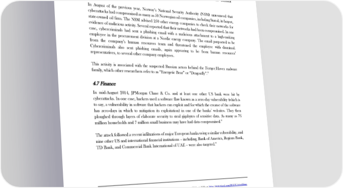 PUTIN’S CYBERWAR technicians had to physically travel to substations to manually close breakers that the hackers had 35 digitally opened. The attacks featured a modified version of the Russia-designed “BlackEnergy”, which is a kind of malware known as a Trojan horse that remotely takes over computers in order to carry out DDoS 36 attacks. The US-based security firm iSight Partners associates this particular malware with a cybercriminal group it calls the Sandworm Team, which it believes is tied to the Russian 37 government. In August of the previous year, Norway’s National Security Authority (NSM) announced that cyberattacks had compromised as many as 50 Norwegian oil companies, including Statoil, its largest, state-owned oil firm. The NSM advised 250 other energy companies to check their networks for evidence of malicious activity. Several reported that their networks had been compromised. In one case, cybercriminals had sent a phishing email with a malicious attachment to a high-ranking employee in the procurement division at a Nordic energy company. The email purported to be from the company’s human resources team and threatened the employee with dismissal. Cybercriminals also sent phishing emails, again appearing to be from human resources’ representatives, to several other company employees. This activity is associated with the suspected Russian actors behind the Fertger/Havex malware 38 family, which other researchers refer to as “Energetic Bear” or “Dragonfly”. 4.7 Finance In mid-August 2014, JPMorgan Chase & Co. and at least one other US bank were hit by cyberattacks. In one case, hackers used a software flaw known as a zero-day vulnerability (which is to say, a vulnerability in software that hackers can exploit and for which the creator of the software has zero-days in which to mitigation its exploitation) in one of the banks’ websites. They then ploughed through layers of elaborate security to steal gigabytes of sensitive data. As many as 76 39 million households and 7 million small business may have had data compromised. The attack followed a recent infiltrations of major European banks using a similar vulnerability, and nine other US and international financial institutions – including, Bank of America, Regions Bank, 40 TD Bank, and Commercial Bank International of UAE – were also targeted. 35 Zetter, K. ‘Everything We Know About Ukraine’s Power Plant Hack’, Wired, 20 January 2016, available at: https://www.wired.com/2016/01/everything- we-know-about-ukraines-power-plant-hack/, last visited: 6 May 2016. 36 See: Kovacs, E. ‘Ukraine Accuses Russia of Hacking Power Companies’, Security Week, 30 December 2015, available at: http://www.securityweek.com/ukraine-accuses-russia-hacking-power-companies, last visited: 6 May 2016. 37 Hultquist, J., ‘Sandworm Team and the Ukrainian Power Authority Attacks’, iSight, 7 January 2016, available at: https://www.isightpartners.com/2016/01/ukraine-and-sandworm-team/, last visited: 6 May 2016. 38 ‘Cyber Threats to the Nordic Region’, FireEye, 11 May 2015, available at: https://www.fireeye.com/content/dam/fireeye-www/global/en/current- threats/pdfs/rpt-nordic-threat-landscape.pdf, last visited: 6 May 2016, p. 10. 39 Goldstein, M. and Perlroth, N. and David E. Sanger, ‘Hackers’ Attack Cracked 10 Financial Firms in Major Assault’, The New York Times, 3 October 2014, available at: http://dealbook.nytimes.com/2014/10/03/hackers-attack-cracked-10-banks-in-major-assault/?_php=true&_type=blogs&_r=1 last visited: 13 May 2016. 40 Waterman, S. ‘US banks targeted in new Russian hack’, Politico, 5 December 2015, available at: http://www.politico.eu/article/us-banks-russia-hack- malware-cyber/, last visited: 13 May 2016. 9