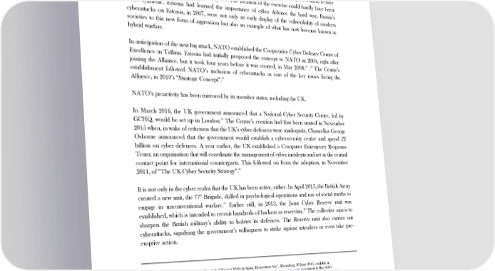 PUTIN’S CYBERWAR 2015 as a 488-page complaint, that the activities of Russian criminal networks are virtually indistinguishable from those of the government.51 6. What Is Being Done? In April 2015, 400 soldiers and civilians gathered in a hotel in the Estonian capital Tallinn to take part in NATO’s biggest ever cyberwar game. The location of the exercise could hardly have been more symbolic. Estonia had learned the importance of cyber defence the hard way. Russia’s cyberattacks on Estonia, in 2007, were not only an early display of the vulnerability of modern societies to this new form of aggression but also an example of what has now become known as hybrid warfare. In anticipation of the next big attack, NATO established the Cooperative Cyber Defence Centre of Excellence in Tallinn. Estonia had initially proposed the concept to NATO in 2004, right after 52 53 joining the Alliance, but it took four years before it was created, in May 2008. . The Centre’s establishment followed NATO’s inclusion of cyberattacks as one of the key issues facing the 54 Alliance, in 2010’s “Strategic Concept”. NATO’s proactivity has been mirrored by its member states, including the UK. In March 2016, the UK government announced that a National Cyber Security Centre, led by 55 GCHQ, would be set up in London. The Centre’s creation had first been muted in November 2015 when, in wake of criticisms that the UK’s cyber defences were inadequate, Chancellor George Osborne announced that the government would establish a cybersecurity centre and spend £2 billion on cyber defences. A year earlier, the UK established a Computer Emergency Response Team; an organisation that will coordinate the management of cyber incidents and act as the central contact point for international counterparts. This followed on from the adoption, in November 56 2011, of “The UK Cyber Security Strategy”. It is not only in the cyber realm that the UK has been active, either. In April 2015, the British Army th created a new unit, the 77 Brigade, skilled in psychological operations and use of social media to 57 engage in unconventional warfare. Earlier still, in 2013, the Joint Cyber Reserve unit was 58 established, which is intended to recruit hundreds of hackers as reservists. The collective aim is to sharpen the British military’s ability to bolster its defences. The Reserve unit also carries out cyberattacks, signifying the government’s willingness to strike against intruders or even take pre- emptive action. 51 Duarte, E. and Henry Meyer, ‘Putin Allies Aided Russian Mafia in Spain, Prosecutors Say’, Bloomberg, 29 June 2015, available at: http://www.bloomberg.com/news/articles/2015-06-29/putin-allies-aided-russian-mafia-in-spain-prosecutors-say, last visited: 6 May 2016. 52 ‘NATO opens new centre of excellence on cyber defence’, NATO, 14 May 2008, available at: http://www.nato.int/docu/update/2008/05- may/e0514a.html, last visited: 6 May 2016. 53 Ibid. 54 ‘Strategic Concept For the Defence and Security of The Members of the North Atlantic Treaty Organisation’, NATO, 20 November 2010, available at: http://www.nato.int/lisbon2010/strategic-concept-2010-eng.pdf, last visited: 9 May 2016. 55 ‘Press release: New National Cyber Security Centre set to bring UK expertise together’, GCHQ, 18 March 2016, available at: https://www.gov.uk/government/news/new-national-cyber-security-centre-set-to-bring-uk-expertise-together, last visited: 6 May 2016. 56 ‘The UK Cyber Security Strategy: Protecting and promoting the UK in a digital world”, UK Government, 25 November 2011, available at: https://www.gov.uk/government/uploads/system/uploads/attachment_data/file/60961/uk-cyber-security-strategy-final.pdf, last visited: 9 May 2016. 57 MacAskill, E. ‘British army creates team of Facebook warriors’, The Guardian, 31 January 2015, available at: http://www.theguardian.com/uk- news/2015/jan/31/british-army-facebook-warriors-77th-brigade, last visited: 9 May 2016. 58 Borger, J. ‘“Trident is old technology”: the brave new world of cyber warfare’, The Guardian, 16 January 2016. 12
