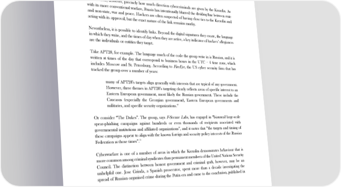 PUTIN’S CYBERWAR technically proficient in the Russian underground,” a criminal case is brought against them and then they suddenly disappear “and those people are never heard from again”. Alperovitch adds that the hacker in question is then working for the Russian security services.47 Such a strategy – of offering a hacker convicted of cybercrimes the opportunity to work for the FSB instead of receiving a prison sentence – is not new. Oleg Gordievsky, the KGB colonel who defected 48 to MI6 in 1985, described this as early as 1998. It is unclear, however, precisely how much direction cybercriminals are given by the Kremlin. As with its more conventional warfare, Russia has intentionally blurred the dividing line between state and non-state, war and peace. Hackers are often suspected of having close ties to the Kremlin and acting with its approval, but the exact nature of the link remains murky. Nevertheless, it is possible to identify links. Beyond the digital signatures they create, the language in which they write, and the times of day when they are active, a key indicator of hackers’ allegiances are the individuals or entities they target. Take APT28, for example. The language much of the code the group write in is Russian, and it is written at times of the day that correspond to business hours in the UTC + 4 time zone, which includes Moscow and St. Petersburg. According to FireEye, the US cyber security firm that has tracked the group over a number of years: many of APT28’s targets align generally with interests that are typical of any government. However, three themes in APT28’s targeting clearly reflects areas of specific interest to an Eastern European government, most likely the Russian government. These include the Caucasus (especially the Georgian government), Eastern European governments and 49 militaries, and specific security organizations. Or consider “The Dukes”. The group, says F-Secure Labs, has engaged in “biannual large-scale spear-phishing campaigns against hundreds or even thousands of recipients associated with governmental institutions and affiliated organizations”, and it notes that “the targets and timing of these campaigns appear to align with the known foreign and security policy interests of the Russian 50 Federation at those times”. Cyberwarfare is one of a number of areas in which the Kremlin demonstrates behaviour that is more common among criminal syndicates than permanent members of the United Nations Security Council. The distinction between honest government and criminal graft, however, may be an unhelpful one. Jose Grinda, a Spanish prosecutor, spent more than a decade investigating the spread of Russian organised crime during the Putin era and came to the conclusion, published in 47 Bennett, C., ‘Kremlin’s ties to Russian cyber gangs sow US concerns’, The Hill, 11 October 2015, available at: http://thehill.com/policy/cybersecurity/256573-kremlins-ties-russian-cyber-gangs-sow-us-concerns, last visited: 6 May 2016. 48 Flook, K. ‘Russia and the Cyber Threat’, Critical Threats, 13 May 2009, available at: http://www.criticalthreats.org/russia/russia-and-cyber-threat, last visited: 11 May 2016. 49 ‘APT28: A Window Into Russia’s Cyber Espionage Operations?’, FireEye, 5 February 2010, available at: https://www2.fireeye.com/rs/fireye/images/rpt- apt28.pdf, last visited: 6 May 2016, p. 6 50 Ibid., p. 3. 11
