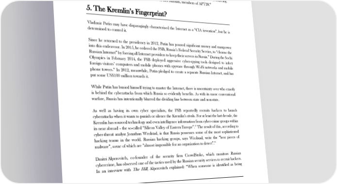 PUTIN’S CYBERWAR The FBI initially linked the hackers to Russia, and cybersecurity experts have added further substance to this belief since. The US-based cybersecurity firm root9B analysed the malware used 41 in the hacks and found code and signatures previously associated with APY28. Eleven months earlier, on 23 October 2013, the Warsaw Stock Exchange was hit by a series of cyberattacks. Data were stolen, client login details were made public online, and the Exchange’s systems were made accessible to cybercriminals of all stripes. It was sabotage by crowd-sourcing. 42 The hackers claimed to be from ISIS, but were in fact Russian, members of APT28. 5. The Kremlin’s Fingerprint? Vladimir Putin may have disparagingly characterised the Internet as a “CIA invention”, but he is determined to control it. Since he returned to the presidency in 2012, Putin has poured significant money and manpower into this endeavour. In 2015, he ordered the FSB, Russia’s Federal Security Service, to “cleanse the 43 Russian Internet” by forcing all Internet providers to keep their servers in Russia. During the Sochi Olympics in February 2014, the FSB deployed aggressive cyber-spying tools designed to infect foreign visitors’ computers and mobile phones with spyware through Wi-Fi networks and mobile 44 phone towers. In 2012, meanwhile, Putin pledged to create a separate Russian Internet, and has put some US$100 million towards it. While Putin has busied himself trying to master the Internet, there is uncertainty over who exactly is behind the cyberattacks from which Russia so evidently benefits. As with its more conventional warfare, Russia has intentionally blurred the dividing line between state and non-state. As well as having its own cyber specialists, the FSB reportedly recruits hackers to launch cyberattacks when it wants to punish or silence the Kremlin’s rivals. For at least the last decade, the Kremlin has sourced technology and even intelligence information from cyber-crime groups within 45 its near abroad – the so-called “Silicon Valley of Eastern Europe”. The result of this, according to cyber-threat analyst Jonathan Wrolstad, is that Russia possesses some of the most sophisticated hacking teams in the world. Russian hacking groups, says Wrolstad, write the “best pieces of 46 malware”, some of which are “almost impossible for an organization to detect”. Dmitri Alperovitch, co-founder of the security firm CrowdStrike, which monitors Russian cybercrime, has observed one of the tactics used by the Russian security services to recruit hackers. In an interview with The Hill, Alperovitch explained: “When someone is identified as being 41 ‘APT28 Targets Financial Markets: Zero Day Hashes Released’, root9B, 5 November 2015, available at: http://www.mediafire.com/download/bdr77piwp0ij0qz/FSOFACY.pdf, last visited: 13 May 2016. 42 Riley, M. and Jordan Robertson, ‘Cyberspace Becomes Second Front in Russia’s Clash With NATO’, Bloomberg, 14 October 2015. 43 ‘Russia Update: At FSB Meeting, Putin Portrays Russia as Innocent Victim of Hostile World’, The Interpreter, 26 March 2015, available at: http://www.interpretermag.com/russia-update-march-26-2015/, last visited: 6 May 2016. 44 Matthews, O., ‘Russia’s Greatest Weapon May Be Its Hackers’, Newsweek, 5 July 2015, available at: http://www.newsweek.com/2015/05/15/russias- greatest-weapon-may-be-its-hackers-328864.html, last visited: 6 May 2016. 45 One reason for the prevalence of such individuals is the Soviet legacy of emphasising maths and science education, which has resulted in high-qualified software writers and hackers. See, Flook, K. ‘Russia and the Cyber Threat’, Critical Threats, 13 May 2009, available at: http://www.criticalthreats.org/russia/russia-and-cyber-threat, last visited: 11 May 2016. 46 Bennett, C., ‘Kremlin’s ties to Russian cyber gangs sow US concerns’, The Hill, 11 October 2015, available at: http://thehill.com/policy/cybersecurity/256573-kremlins-ties-russian-cyber-gangs-sow-us-concerns, last visited: 6 May 2016. 10