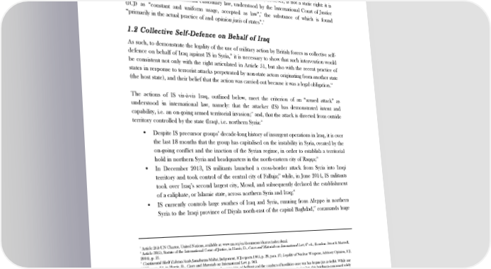 THE LEGAL CASE FOR BRITISH MILITARY ACTION IN IRAQ AND SYRIA the use of force to maintain or restore international peace and security; or, where a state is 7 exercising its fundamental right to self-defence. As such, legitimate use of force in self-defence does not require a UNSC resolution. The right of self-defence is recognised in international treaty law by Article 51 of the UN Charter which articulates “the inherent right of individual or collective self-defence if an armed attack occurs against a Member of the United Nations”. Self-defence, however, is not a static right: it is also recognised in international customary law, understood by the International Court of Justice (ICJ) as “constant and uniform usage, accepted as law”,8 the substance of which is found 9 “primarily in the actual practice of and opinion juris of states”. 1.2 Collective Self-Defence on Behalf of Iraq As such, to demonstrate the legality of the use of military action by British forces as collective self- 10 defence on behalf of Iraq against IS in Syria, it is necessary to show that such intervention would be consistent not only with the right articulated in Article 51, but also with the recent practice of states in response to terrorist attacks perpetrated by non-state actors originating from another state 11 (the host state), and their belief that the action was carried out because it was a legal obligation. The actions of IS vis-à-vis Iraq, outlined below, meet the criterion of an “armed attack” as understood in international law, namely: that the attacker (IS) has demonstrated intent and capability, i.e. an on-going armed territorial invasion;12 and, that the attack is directed from outside 13 territory controlled by the state (Iraq), i.e. northern Syria: • Despite IS precursor groups’ decade-long history of insurgent operations in Iraq, it is over the last 18 months that the group has capitalised on the instability in Syria, created by the on-going conflict and the inaction of the Syrian regime, in order to establish a territorial hold in northern Syria and headquarters in the north-eastern city of Raqqa;14 • In December 2013, IS militants launched a cross-border attack from Syria into Iraqi 15 territory and took control of the central city of Falluja; while, in June 2014, IS militants took over Iraq’s second largest city, Mosul, and subsequently declared the establishment of a caliphate, or Islamic state, across northern Syria and Iraq;16 • IS currently controls large swathes of Iraq and Syria, running from Aleppo in northern 17 Syria to the Iraqi province of Diyala north-east of the capital Baghdad, commands huge 7 Article 2(4) UN Charter, United Nations, available at: www.un.org/en/documents/charter/index.shtml. 8 Article 38(1), Statute of the International Court of Justice, in Harris, D., Cases and Materials on International Law, 6th ed., (London: Sweet & Maxwell, 2004), p. 21. 9 Continental Shelf (Libyan/Arab Jamahiriya/Malta), Judgement, ICJ reports 1985, p. 29, para. 27; Legality of Nuclear Weapons, Advisory Opinion, ICJ, 1997, para. 64, in Harris, D., Cases and Materials on International Law, p. 963. 10 International law regulates the use of military force by states (jus ad bellum) and the conduct of hostilities once war has begun (jus in bello). While any military action undertaken by British forces would be subject to the latter in the form of international humanitarian law, this briefing is concerned solely with the former, specifically the legality of the use of force by the UK against IS in Syria. 11 Since the 9/11 terrorist attacks perpetrated by al-Qaeda against the US in 2001, it is widely (but not universally) accepted that a state can act in self- defence against a non-state actor as well as another state, most notably in response to terrorism-related attacks or the threat of imminent attack. See: ‘Principles of International Law on the Use of Force by States in Self-Defence’, (2005), International Law Programme Working Paper, Chatham House, available at: www.chathamhouse.org/publications/papers/view/108106, p. 11. 12 ‘Principles of International Law on the Use of Force by States in Self-Defence’, Chatham House, p. 11. 13 Legal Consequences of the Construction of a Wall in the Occupied Palestinian Territory, Advisory Opinion, ICJ, 2004, para. 139. 14 ‘Islamic State Rule: Municipal Services and Public Beheadings’, NPR, 12 September 2014, available at: www.npr.org/blogs/parallels/2014/09/12/347748371/islamic-state-rule-municipal-services-and-public-beheadings. 15 ‘What is Islamic State?’, BBC News, 12 September 2014, available at: www.bbc.co.uk/news/world-middle-east-29052144. 16 ibid. 17 ‘Struggle for Iraq: In maps’, BBC News, 16 September 2014, available at: www.bbc.co.uk/news/world-middle-east-27838034. 4