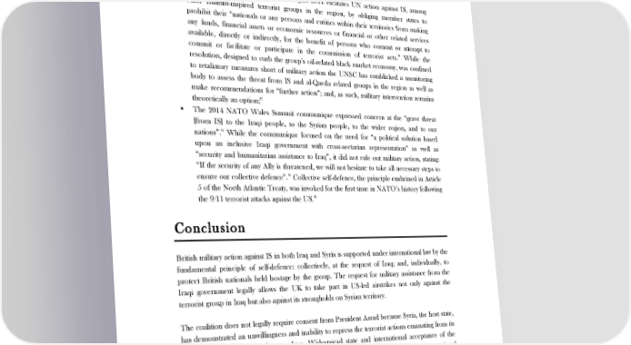 THE LEGAL CASE FOR BRITISH MILITARY ACTION IN IRAQ AND SYRIA Recent statements and actions by states and international bodies which condemn IS, restrict its funding or are broadly supportive of action against the group confer further legitimacy, both politically and legally, on military intervention. While the European Council (EC), for example, has condemned IS and recognised the threat to Europe posed by the group, both the UN and NATO have gone further and indicated possible support for military intervention against IS: • UNSC Resolution 2170 passed in August 2014 escalates UN action against IS, among other Islamist-inspired terrorist groups in the region, by obliging member states to prohibit their “nationals or any persons and entities within their territories from making any funds, financial assets or economic resources or financial or other related services available, directly or indirectly, for the benefit of persons who commit or attempt to commit or facilitate or participate in the commission of terrorist acts.” While the resolution, designed to curb the group’s oil-related black market economy, was confined to retaliatory measures short of military action the UNSC has established a monitoring body to assess the threat from IS and al-Qaeda related groups in the region as well as make recommendations for “further action”; and, as such, military intervention remains 83 theoretically an option; • The 2014 NATO Wales Summit communique expressed concern at the “grave threat [from IS] to the Iraqi people, to the Syrian people, to the wider region, and to our 84 nations”. While the communique focused on the need for “a political solution based upon an inclusive Iraqi government with cross-sectarian representation” as well as “security and humanitarian assistance to Iraq”, it did not rule out military action, stating: “If the security of any Ally is threatened, we will not hesitate to take all necessary steps to 85 ensure our collective defence”. Collective self-defence, the principle enshrined in Article 5 of the North Atlantic Treaty, was invoked for the first time in NATO’s history following the 9/11 terrorist attacks against the US.86 Conclusion British military action against IS in both Iraq and Syria is supported under international law by the fundamental principle of self-defence: collectively, at the request of Iraq; and, individually, to protect British nationals held hostage by the group. The request for military assistance from the Iraqi government legally allows the UK to take part in US-led airstrikes not only against the terrorist group in Iraq but also against its strongholds on Syrian territory. The coalition does not legally require consent from President Assad because Syria, the host state, has demonstrated an unwillingness and inability to repress the terrorist actions emanating from its territory that continue to threaten Iraq. Widespread state and international acceptance of the legality of the NATO invasion of Afghanistan in 2001 supports this interpretation of international law, which is also consistent with stated UK policy. 83 Al-Khatteeb, L., ‘The UN Strikes Back at ISIL's Black Economy’, The Huffington Post, 23 August 2014, available at: www.brookings.edu/research/opinions/2014/08/23-un-strikes-back-at-isil-black-economy. 84 ‘NATO Wales Summit 2014: outcomes’, House of Commons Library Standard Note, (12 September 2014), available at: www.parliament.uk/briefing- papers/SN06981/nato-wales-summit-2014-outcomes, p.11. 85 ‘NATO Wales Summit 2014: outcomes’, House of Commons Library Standard Note, (12 September 2014), p.11. 86 ‘Collective defence’, NATO web page, last updated 2 June 2014, available at: www.nato.int/cps/en/natohq/topics_110496.htm?. 14