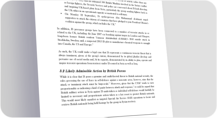THE LEGAL CASE FOR BRITISH MILITARY ACTION IN IRAQ AND SYRIA • Between 19 August and 13 September 2014, the group released three propaganda videos showing the beheading of American journalists James Foley and Steven Sotloff, and the 58 British aid worker David Haines, all apparently by the same man with a British accent. Currently British aid worker Alan Henning and British journalist John Cantlie are being held hostage by IS, reportedly in Syria;59 • On 29 August 2014, the Joint Terrorism Analysis Centre (JTAC) raised the threat level in the UK, from “substantial” to “severe”, in response to recent IS activity rather than any 60 specific plot; and, with an estimated 500 British Muslims involved in the Syrian conflict as foreign fighters, the Security Services and police are concerned about IS both directing and inspiring UK-based plots from Syria, particularly the group sending fighters back to the UK either in an operational capacity or motivated to self-start; • On Monday 22 September, IS spokesperson Abu Muhammad al-Adnani urged supporters to attack the citizens of countries that have pledged to join President Obama’s 61 coalition against the group, which includes the UK. In addition, IS precursor groups have been connected to a number of terrorist attacks in or related to the UK, including: the June 2007 car bombing against targets in London and Glasgow; Iraqi-born former British resident Taimour Abdulwahab al-Abdaly’s 2010 suicide attack in Stockholm, Sweden; and, a suspected 2013 IS plot to manufacture chemical weapons to smuggle into Canada, the US and Europe.62 As such, the UK could make a legal case that IS represents a continuous terrorist threat that is always imminent, given: a) the group’s intent, demonstrated by its global jihadist ideology and pervasive use of social media and, b) its capacity, demonstrated by its ability to plan, operate and inspire terrorist operations from territory under IS control in Syria as well as Iraq. 3.2 Likely Admissible Action by British Forces While it is clear that IS poses a genuine and multi-faceted threat to British national security, the rules governing the use of force in self-defence against a non-state actor, however, state that the 63 attack or imminent attack must be large-scale. Moreover, given that the UNSC tends to view proportionality as indicating a kind of parity between attack and response,64 it could be argued that British military action in Syria against IS undertaken as individual self-defence would lawfully be limited to necessary and proportionate action taken as a last resort to protect British nationals. This would most likely manifest as targeted Special Air Service (SAS) operations to locate and retrieve British nationals being held hostage by the group in Syrian territory. 58 ‘Isis video claims to show beheading of British hostage David Haines’, The Guardian, 14 September 2014, available at: www.theguardian.com/world/2014/sep/13/isis-video-david-haines-beheading. 59 ‘British man held by IS is ex-cabbie from Salford’, ITV News, 16 September 2014, available at: www.itv.com/news/granada/story/2014-09-16/british- man-held-by-is-is-ex-cabbie-from-salford/. 60 ‘Threat level from international terrorism raised’, Prime Minister’s Press Statement, 29 August 2014, available at: www.gov.uk/government/speeches/threat-level-from-international-terrorism-raised-pm-press-conference. 61 ‘Islamic State urges attacks on U.S., French citizens, taunts Obama’, Reuters, 22 September 2014, available at: www.reuters.com/article/2014/09/22/us- iraq-crisis-adnani-idUSKCN0HH1MB20140922. 62 Simcox, R., ‘ISIS’ Western Ambitions’, Foreign Affairs, 30 June 2014, available at: www.foreignaffairs.com/articles/141611/robin-simcox/isis-western- ambitions. 63 Nicaragua, ICJ reports 1986, p. 14, para 195, in Harris, D., Cases and Materials on International Law, p.899. 64 Sir Daniel Bethlehem Q.C., in ‘Principles of International Law on the Use of Force by States in Self-Defence’, Chatham House, p. 53. 10