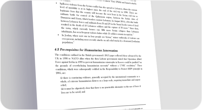 THE LEGAL CASE FOR BRITISH MILITARY ACTION IN IRAQ AND SYRIA In addition, aside from the situation in Iraq, there are increasing levels of spill-over violence into Syria’s neighbours: • Between 19 and 21 September 2014, approximately 130,000 Kurdish refugees entered Turkey after IS advances threatened the Syrian town of Kobane. This latest influx has inflamed long-standing tension between the Kurds and the Turks, with the latter fearing that new recruits to the Kurdish militias fighting IS may also align themselves with the proscribed terrorist organisation the Kurdistan Workers’ Party (PKK) and launch attacks 75 on Turkey; • Spill-over violence from the Syrian conflict has also spread to Lebanon, where the current level of instability is at its highest since the end of the civil war in 1990. There are legitimate fears that the country will become the next front in the Syrian civil war as militants battle for control of the Qalamoun region, between the Syrian cities of Damascus and Homs, which borders eastern Lebanon. In August 2014, a five-day battle between Lebanese forces and militants from IS and JN in the Sunni border town of Arsal 76 resulted in the death of 19 Lebanese soldiers and the capture of 30 more. Since then, the town, which currently houses one fifth more Syrian refugees than Lebanese inhabitants, has seen frequent violent clashes while 21 soldiers remain in captivity.77 78 • In Jordan, where now one in four people are Syrian, minor outbreaks of violence are ever-present, including most recently attacks on aid relief trucks by a frustrated Jordanian population.79 4.2 Pre-requisites for Humanitarian Intervention The conditions outlined in the British government’s 2013 paper reflected those advanced by the UK in 1998 to NATO allies when the then Labour government stated that Operation Allied Force against Serbia in 1999 to prevent humanitarian catastrophe in Kosovo could be justified “on 80 the grounds of overwhelming humanitarian necessity” without a UNSC resolution. These conditions, which were subsequently codified in the Responsibility to Protect (R2P) principle in 2005, are: (i) there is convincing evidence, generally accepted by the international community as a whole, of extreme humanitarian distress on a large scale, requiring immediate and urgent relief; (ii) it must be objectively clear that there is no practicable alternative to the use of force if lives are to be saved; and 75 ‘Turkey clamps down on Syria border after Kurdish unrest’, BBC News, 22 September 2014, available at: www.bbc.co.uk/news/world-middle-east- 29306088/; see also: ‘Al-Qaeda's brutal tactics in Syria force out moderates’, BBC News, 27 November 2013, available at: www.bbc.co.uk/news/world- 25109708. 76 J.N., ‘Lebanon and the Islamic State: Not us too’, The Economist, 7 August 2014, available at: www.economist.com/blogs/pomegranate/2014/08/lebanon-and-islamic-state. 77 ‘New deadly blast rocks Lebanese border town of Arsal’, Middle East Eye, 19 September 2014, available at: www.middleeasteye.net/news/lebanon- 395725240#sthash.TEWT639w.dpuf. 78 ‘Syrian refugees in Lebanon and the British role’, Syrian Observatory for Human Rights, available at: http://syriahr.com/en/index.php?option=com_articles&aid=32&Itemid=5&task=displayarticle#.VB]wZBPnBf_c. 79 Porges, Marisa L., ‘Fragile Sanctuary: Jordan Buckles under the Stress of Hosting Syrian Refugees’, Foreign Affairs, 12 March 2014, available at: www.foreignaffairs.com/articles/141024/marisa-l-porges/fragile-sanctuary. 80 Bethlehem, D., ‘Stepping Back a Moment – The Legal Basis in Favour of a Principle of Humanitarian Intervention’, EIJL Talk!, 12 September 2013, available at: www.ejiltalk.org/stepping-back-a-moment-the-legal-basis-in-favour-of-a-principle-of-humanitarian-intervention/. 12