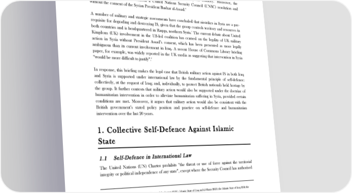 THE LEGAL CASE FOR BRITISH MILITARY ACTION IN IRAQ AND SYRIA Introduction On 22 September 2014, the United States (US) launched airstrikes against the proscribed terrorist 1 2 organisation Islamic State (IS) in northern Syria, in partnership with several Arab allies. The intervention marks the expansion of the US-led military campaign against IS in Iraq, where the 3 US previously launched approximately 190 airstrikes, into Syrian territory. Moreover, the airstrikes were conducted without a United Nations Security Council (UNSC) resolution and 4 without the consent of the Syrian President Bashar al-Assad. A number of military and strategic assessments have concluded that airstrikes in Syria are a pre- requisite for degrading and destroying IS, given that the group controls territory and resources in both countries and is headquartered in Raqqa, northern Syria.5 The current debate about United Kingdom (UK) involvement in the US-led coalition has centred on the legality of UK military action in Syria without President Assad’s consent, which has been presented as more legally ambiguous than its current involvement in Iraq. A recent House of Commons Library briefing paper, for example, was widely reported in the UK media as suggesting that intervention in Syria 6 “would be more difficult to justify”. In response, this briefing makes the legal case that British military action against IS in both Iraq and Syria is supported under international law by the fundamental principle of self-defence: collectively, at the request of Iraq; and, individually, to protect British nationals held hostage by the group. It further contests that military action would also be supported under the doctrine of humanitarian intervention in order to alleviate humanitarian suffering in Syria, provided certain conditions are met. Moreover, it argues that military action would also be consistent with the British government’s stated policy position and practice on self-defence and humanitarian intervention over the last 20 years. 1. Collective Self-Defence Against Islamic State 1.1 Self-Defence in International Law The United Nations (UN) Charter prohibits “the threat or use of force against the territorial integrity or political independence of any state”, except where the Security Council has authorised 1 Formerly (or also) known as Islamic State of Iraq and the Levant (ISIL); Islamic State of Iraq and al-Sham (ISIS); the Islamic State of Iraq (ISI); the Mujahideen Shura Council (MSC); and, al-Qaeda in Iraq (AQI). 2 The Pentagon named Bahrain, Jordan, Saudi Arabia, Qatar and the United Arab Emirates as “partners”. See: ‘Syria: US begins air strikes on Islamic State targets’, BBC News, 23 September 2014, available at: www.bbc.co.uk/news/world-middle-east-29321136. 3 ibid. 4 In August 2014, Syrian Foreign Minister Walid Muallem stated that any action without consent from the Syrian regime would be “considered aggression”, a view supported by Syrian allies Russia and Iran. See: ‘Syria: US begins air strikes on Islamic State targets’, BBC News, 23 September 2014. 5 Smith, B., Claire Mills and Rob Page, ‘Iraq, Syria and ISIS - recent developments’, House of Commons Library Standard Note (9 September 2014), available at: www.parliament.uk/briefing-papers/SN06977/iraq-syria-and-isis-recent-developments, p. 18; Former US Assistant Secretary of State P.J. Crowley, ‘Viewpoint: IS won't be destroyed without Syria change’, BBC News, 12 September, available at: www.bbc.co.uk/news/world-us-canada- 29168779. 6 ‘Iraq, Syria and ISIS - recent developments’, House of Commons Library Standard Note, 9 September 2014; see also: ‘Islamic State: Air strikes on Isis in Syria could be illegal’, The Independent, 15 September 2014, available at: http://www.independent.co.uk/news/world/middle-east/islamic-state-air- strikes-on-isis-in-syria-could-be-illegal-9734474.html. 3