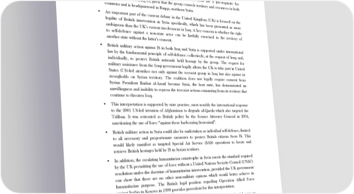 THE LEGAL CASE FOR BRITISH MILITARY ACTION IN IRAQ AND SYRIA Summary • The proscribed organisation ‘Islamic State’ (IS) is the pre-eminent terrorist group in the Middle East, threatening both international peace and security and the British national interest. With the international military campaign against the group in Iraq underway, strategic assessments have concluded that airstrikes in Syria are a pre-requisite for degrading and destroying IS, given that the group controls territory and resources in both countries and is headquartered in Raqqa, northern Syria. • An important part of the current debate in the United Kingdom (UK) is focused on the legality of British intervention in Syria specifically, which has been presented as more ambiguous than the UK’s current involvement in Iraq. A key concern is whether the right to self-defence against a non-state actor can be lawfully exercised in the territory of another state without the latter’s consent. • British military action against IS in both Iraq and Syria is supported under international law by the fundamental principle of self-defence: collectively, at the request of Iraq; and, individually, to protect British nationals held hostage by the group. The request for military assistance from the Iraqi government legally allows the UK to take part in United States (US)-led airstrikes not only against the terrorist group in Iraq but also against its strongholds on Syrian territory. The coalition does not legally require consent from Syrian President Bashar al-Assad because Syria, the host state, has demonstrated an unwillingness and inability to repress the terrorist actions emanating from its territory that continue to threaten Iraq. • This interpretation is supported by state practice, most notably the international response to the 2001 US-led invasion of Afghanistan to degrade al-Qaeda which also targeted the Taliban. It was reiterated as British policy by the former Attorney General in 2004, sanctioning the use of force “against those harbouring [terrorists]”. • British military action in Syria could also be undertaken as individual self-defence, limited to all necessary and proportionate measures to protect British citizens from IS. This would likely manifest as targeted Special Air Service (SAS) operations to locate and retrieve British hostages held by IS in Syrian territory. • In addition, the escalating humanitarian catastrophe in Syria meets the standard required by the UK permitting the use of force without a United Nations Security Council (UNSC) resolution under the doctrine of humanitarian intervention, provided the UK government can show that there are no other non-military options which would better achieve its humanitarian purpose. The British legal position regarding Operation Allied Force against Serbia in Kosovo in 1999 provides precedent for this interpretation. • Subject to the conditions of necessity and proportionality, there is no legal barrier to British involvement in military action by the growing international coalition against IS in both Iraq and Syria. Intervention would not only be consistent with the UK government’s stated policy position and practice over the last 20 years, but also in the British national interest. 2
