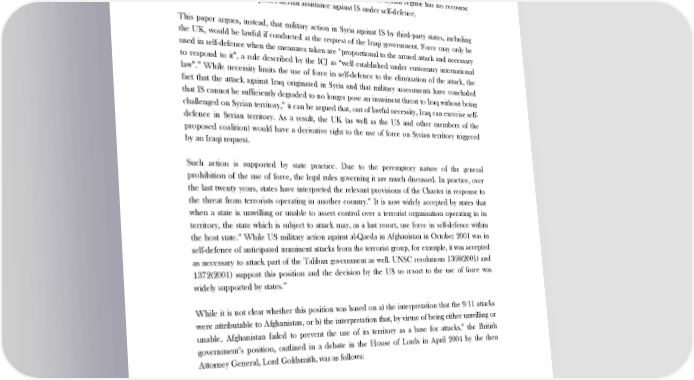 THE LEGAL CASE FOR BRITISH MILITARY ACTION IN IRAQ AND SYRIA in the case of Syria, whose President has been described by Cameron as ‘part of the 37 problem, not part of the solution’. The logic inherent in this statement, however, is that if Syria were to request assistance from the UK to act against IS, Assad’s lack of legitimacy would be problematic. The exemption to the prohibition on the use of force in self-defence, however, is only applicable when the attack or threat originates from territory outside the victim state. Given that IS territorial conquests began in Syria, and that the group is headquartered on Syrian territory, the Syrian regime has no recourse in international law to request external assistance against IS under self-defence. This paper argues, instead, that military action in Syria against IS by third-party states, including the UK, would be lawful if conducted at the request of the Iraqi government. Force may only be used in self-defence when the measures taken are “proportional to the armed attack and necessary to respond to it”, a rule described by the ICJ as “well established under customary international 38 law”. While necessity limits the use of force in self-defence to the elimination of the attack, the fact that the attack against Iraq originated in Syria and that military assessments have concluded that IS cannot be sufficiently degraded to no longer pose an imminent threat to Iraq without being challenged on Syrian territory,39 it can be argued that, out of lawful necessity, Iraq can exercise self- defence in Syrian territory. As a result, the UK (as well as the US and other members of the proposed coalition) would have a derivative right to the use of force on Syrian territory triggered by an Iraqi request. Such action is supported by state practice. Due to the peremptory nature of the general prohibition of the use of force, the legal rules governing it are much discussed. In practice, over the last twenty years, states have interpreted the relevant provisions of the Charter in response to 40 the threat from terrorists operating in another country. It is now widely accepted by states that when a state is unwilling or unable to assert control over a terrorist organisation operating in its territory, the state which is subject to attack may, as a last resort, use force in self-defence within the host state.41 While US military action against al-Qaeda in Afghanistan in October 2001 was in self-defence of anticipated imminent attacks from the terrorist group, for example, it was accepted as necessary to attack part of the Taliban government as well. UNSC resolutions 1368(2001) and 1372(2001) support this position and the decision by the US to resort to the use of force was widely supported by states.42 While it is not clear whether this position was based on a) the interpretation that the 9/11 attacks were attributable to Afghanistan, or b) the interpretation that, by virtue of being either unwilling or 43 unable, Afghanistan failed to prevent the use of its territory as a base for attacks, the British government’s position, outlined in a debate in the House of Lords in April 2004 by the then Attorney General, Lord Goldsmith, was as follows: 37 ‘Iraq, Syria and ISIS - recent developments’, House of Commons Library Standard Note, 9 September 2014, p. 18. 38 Nicaragua, ICJ reports 1986, p. 14, para 176, in Harris, D., Cases and Materials on International Law, p.894. 39 ‘Iraq, Syria and ISIS - recent developments’, House of Commons Library Standard Note, 9 September 2014, p. 18; see also, for example, this opinion piece by former US Assistant Secretary of State P.J. Crowley: ‘Viewpoint: IS won't be destroyed without Syria change’, BBC News, 12 September. 40 Tams, Christian J., ‘The Use of Force against Terrorists’, The European Journal of International Law (2009), vol. 20, no. 2, pp.359-397, pp.359-360. 41 ‘Principles of International Law on the Use of Force by States in Self-Defence’, Chatham House, pp. 11-13. 42 Harris, D., Cases and Materials on International Law, pp.943-944. 43 Milanovic, M., ‘Self-defense and Non State Actors: Indeterminacy and the Jus ad Bellum’, EJIL: Talk!, 21 February 2010, available at: http://www.ejiltalk.org/self-defense-and-non-state-actors-indeterminacy-and-the-jus-ad-bellum/. 7