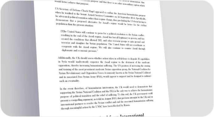 THE LEGAL CASE FOR BRITISH MILITARY ACTION IN IRAQ AND SYRIA (iii) the proposed use of force must be necessary and proportionate to the aim of relief of humanitarian need and must be strictly limited in time and scope to this aim (i.e. the 81 minimum necessary to achieve that end and for no other purpose). While there is little doubt, either by the UK or within the wider international community, that the situation in Syria represents an escalating humanitarian crisis, in order for the UK to lawfully intervene in Syria on humanitarian grounds, the government would need to demonstrate that there is an achievable humanitarian purpose and that there is no other non-military option which would better achieve that purpose. US Secretary of Defense Chuck Hagel appeared to outline the American humanitarian purpose when he testified to the Senate Armed Services Committee on 16 September 2014. Specifically, he advocated political transition rather than regime change, thus precluding the US from having to demonstrate that a proposed alternative for Assad’s regime would be better for the civilian population than the present situation: [T]he United States will continue to press for a political resolution to the Syrian conflict resulting in the end of the Assad regime. Assad has lost all legitimacy to govern, and has created the conditions that allowed ISIL and other terrorist groups to gain ground and terrorize and slaughter the Syrian population. The United States will not coordinate or cooperate with the Assad regime. We will also continue to counter Assad through 82 diplomatic and economic pressure. Additionally, the UK should assess whether action taken in self-defence to degrade IS capabilities in Syria would inadvertently empower the Assad regime to the detriment of the moderate opposition, thereby increasing humanitarian suffering. The US position of increasing the arming and training of the most prominent moderate Syrian opposition group, the National Coalition for Syrian Revolutionary and Opposition Forces (commonly known as the Syrian National Coalition) and its associated Free Syrian Army (FSA), would appear to support (and be designed to militate) such an eventuality. In the event therefore, of humanitarian intervention, the UK would need to demonstrate that supporting the Syrian National Coalition and the FSA is the only way to achieve the humanitarian purpose of political transition and the relief of suffering. To this end, the UK government could present a compelling argument, as it did in August 2013, that previous attempts by the UK and its international partners to resolve the Syrian conflict and end the associated humanitarian suffering through meaningful action by the UNSC have been blocked by Russia. 5. Legitimacy Derived from International Consensus 81 ‘Chemical weapon use by Syrian regime: UK government legal position’, HM Government, 29 August 2013. 82 ‘TRANSCRIPT: Hagel testifies to the Senate Armed Services Committee on the Islamic State’, The Washington Post, 16 September 2014, available at: www.washingtonpost.com/world/national-security/transcript-hagel-testifies-to-the-senate-armed-services-committee-on-the-islamic- state/2014/09/16/a4909e26-3dab-11e4-b0ea-8141703bbf6f_story.html. 13