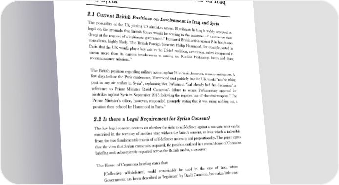 THE LEGAL CASE FOR BRITISH MILITARY ACTION IN IRAQ AND SYRIA • An international crisis meeting held in Paris on 15 September 2014 saw 24 countries as well as the Arab League, the European Union (EU) and the UN condemn the “global 31 threat” from IS and pledge their support for Hayder al-Abadi's new government in Iraq. No consensus, however, emerged on the viability or legality of attacking IS in Syria.32 2. Differences in the British Positions on Iraq and Syria 2.1 Current British Positions on Involvement in Iraq and Syria The possibility of the UK joining US airstrikes against IS militants in Iraq is widely accepted as legal on the grounds that British forces would be coming to the assistance of a sovereign state 33 (Iraq) at the request of a legitimate government. Increased British action against IS in Iraq is also considered highly likely. The British Foreign Secretary Philip Hammond, for example, stated in Paris that the UK would play a key role in the US-led coalition, a comment widely interpreted to mean more than its current involvement in arming the Kurdish Peshmerga forces and flying 34 reconnaissance missions. The British position regarding military action against IS in Syria, however, remains ambiguous. A few days before the Paris conference, Hammond said publicly that the UK would “not be taking part in any air strikes in Syria”, explaining that Parliament “had already had that discussion”, a reference to Prime Minister David Cameron’s failure to secure Parliamentary approval for 35 airstrikes against Syria in September 2013 following the regime’s use of chemical weapons. The Prime Minister’s office, however, responded promptly stating that it was ruling nothing out, a 36 position then echoed by Hammond in Paris. 2.2 Is there a Legal Requirement for Syrian Consent? The key legal concern centres on whether the right to self-defence against a non-state actor can be exercised in the territory of another state without the latter’s consent, an issue which is indivisible from the two fundamental criteria of self-defence: necessity and proportionality. This paper argues that the view that Syrian consent is required, the position outlined in a recent House of Commons briefing and subsequently reported across the British media, is incorrect. The House of Commons briefing states that: [Collective self-defence] could conceivably be used in the case of Iraq, whose Government has been described as ‘legitimate’ by David Cameron, but makes little sense 31 ‘World leaders vow to do “whatever necessary” to defeat Isis jihadis’, The Guardian, 15 September 2014. 32 ibid. 33 ‘Iraq, Syria and ISIS - recent developments’, House of Commons Library Standard Note, 9 September 2014, p.18; in the media see, for example, ‘World leaders vow to do “whatever necessary” to defeat Isis jihadis’, The Guardian, 15 September 2014. 34 ibid. 35 ‘Back into the fray’, The Economist, 20 September 2014, available at: www.economist.com/news/britain/21618825-david-cameron-tries-persuade-war- weary-britons-fight-back-fray?zid=309&ah=80dcf288b8561b012f603b9fd9577f0e. 36 ‘World leaders vow to do “whatever necessary” to defeat Isis jihadis’, The Guardian, 15 September 2014. 6