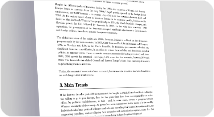 THE STATE OF DEMOCRACY AFTER 25 YEARS control varied.2 By the mid-1990s, growth was established, and, as a concrete indicator of progress, the Czech Republic joined the Organisation for Economic Co-operation and Development (OECD) in 1995, followed by Hungary in 1996. At the same time, the leadership in these countries began to look at membership of the EU as a long-term goal; Hungary applied for EU membership in 1994, followed closely by Romania and Slovakia in 1995, and the Czech Republic in 1996. Though these countries were vulnerable – because of their nascent financial systems and market institutions – to the economic crises of the late 1990s, they adopted shock- therapeutic policies that provided the foundation for future economic growth.3 Despite the different paths of transition during the 1990s, the countries of Central and Eastern Europe began to converge, from the early 2000s.4 Rapid growth, spurred by the benign global environment, saw GDP increase – on average – by 4.5% in all four countries, between 2000 and 2005. As the region moved closer to Western Europe in its economic profile, it concreted its desire to align itself with Western Europe politically: in 2004, the Czech Republic, Hungary, and Slovakia joined the EU, followed by Romania in 2007. In line with their countries’ 1989 aspirations, the governments of the four states accepted significant adjustments to their domestic and foreign policies, in order to join the European community. The global recession of the mid-to-late 2000s, however, initiated a rollback on the democratic progress made by the four countries. In 2009, GDP decreased by 6.8% in Romania and Hungary, 4.9% in Slovakia and 4.5% in the Czech Republic. In response, governments embarked on significant domestic consolidation, in an effort to restore fiscal stability, and introduced populist policies, to appease voters. These economic measures succeeded in halting recession,5 and, since 2009, GDP growth has returned – averaging 1.2% across the four countries, between 2010 and 2013. The financial crisis shifted Central and Eastern Europe’s focus from nurturing democracy to prioritising business interests. Today, the countries’ economies have recovered, but democratic transition has halted and there are real dangers that it will reverse. 3. Main Trends If the first two decades post-1989 demonstrated the lengths to which Central and Eastern Europe was willing to go to join Europe, then the five years since have been accompanied by an active effort, by political establishments, to halt – and, in some cases, reverse – progress towards Western standards of democracy. As power becomes concentrated in the hands of a few wealthy individuals who have political influence and who are extending their control to media outlets, are supporting populism, and are aligning their countries with authoritarian regimes, many fear that this part of Central and Eastern Europe is jeopardising its hard-fought development. 2 Blanchard, O., The Economics of Post-Communist Transition (Oxford: Clarendon Press, 1997). 3 Atoyan, R., Bikas Joshi, Krzysztof Krogulski, James Roaf, and an IMF staff team, ‘25 Years of Transition: Post-Communist Europe and the IMF’ (International Monetary Fund, 2014), available at: http://www.imf.org/external/pubs/ft/reo/2014/eur/eng/pdf/erei_sr_102414.pdf. 4 Åslund, A., How Capitalism Was Built: The Transformation of Central and Eastern Europe, Russia, and Central Asia (New York: Cambridge University Press, 2007). 5 Bakker, B. and Christoph Klingen, eds, How Emerging Europe Came Through the 2008/09 Crisis (Washington: IMF, 2012) 4