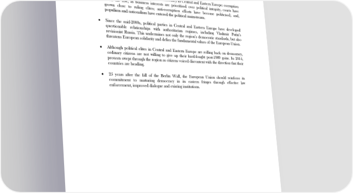 THE STATE OF DEMOCRACY AFTER 25 YEARS Summary x While formal democratic standards are high in Central and Eastern Europe, many of the underpinnings that define a functioning democracy have regressed over recent years, in particular following the global financial crisis. x There exist a number of threats to democracy in Central and Eastern Europe: corruption is on the rise, as business interests are prioritised over political integrity; courts have grown close to ruling elites; anti-corruption efforts have become politicised; and, populism and nationalism have entered the political mainstream. x Since the mid-2000s, political parties in Central and Eastern Europe have developed questionable relationships with authoritarian regimes, including Vladimir Putin’s revisionist Russia. This undermines not only the region’s democratic standards, but also threatens European solidarity and defies the fundamental values of the European Union. x Although political elites in Central and Eastern Europe are rolling back on democracy, ordinary citizens are not willing to give up their hard-fought post-1989 gains. In 2014, protests swept through the region as citizens voiced discontent with the direction that their countries are heading. x 25 years after the fall of the Berlin Wall, the European Union should reinforce its commitment to nurturing democracy in its eastern fringes through effective law enforcement, improved dialogue and existing institutions. 2