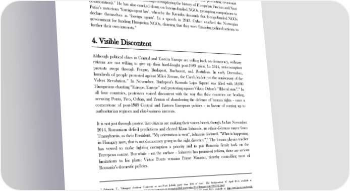 THE STATE OF DEMOCRACY AFTER 25 YEARS 55 nationalism; perhaps none more so than Hungary’s Jobbik, which includes Nazi sympathisers 56 and anti-Semites amongst its supporters. Jobbik’s pro-Russia policies are clear: it wants Hungary to turn its back on the EU and join Putin’s Eurasian Customs Union, and it seeks to maintain the EU’s gas dependence on Russia. Prime Minister Viktor Orban has grown increasingly close with Jobbik, enacting almost all of the party’s promises made in the 2010 parliamentary election campaign and promoting revisionist interpretations of the Holocaust (through downplaying the history of Hungarian Fascism and Nazi collaboration).57 He has also cracked down on foreign-funded NGOs, prompting comparisons to Putin’s notorious ‘foreign-agent law’, whereby the Kremlin demands that foreign-funded NGOs declare themselves as ‘foreign agents’. In a speech in 2013, Orban attacked the Norwegian government for funding Hungarian NGOs, claiming that they were financing political activists to further their own interests.58 4. Visible Discontent Although political elites in Central and Eastern Europe are rolling back on democracy, ordinary citizens are not willing to give up their hard-fought post-1989 gains. In 2014, anti-corruption protests swept through Prague, Budapest, Bucharest, and Bratislava. In early December, hundreds of people protested against Miloš Zeman, the Czech leader, on the anniversary of the Velvet Revolution.59 In November, Budapest’s Kossuth Lajos Square was filled with 10,000 Hungarians chanting “Europe, Europe” and protesting against Viktor Orban’s “illiberal state”.60 In all four countries, protesters voiced discontent with the way that their countries are heading, accusing Ponta, Fico, Orban, and Zeman of abandoning the defence of human rights – once a cornerstone of post-1989 Central and Eastern European politics – in favour of cosying up to authoritarian regimes and elite-business interests. It is not just through protest that citizens are making their voices heard, though. In late November 2014, Romanians defied predictions and elected Klaus Iohannis, an ethnic-German mayor from Transylvania, as their President. “My orientation is west”, Iohannis declared. “What is happening in Hungary now, that is not democracy going in the right direction”.61 The former physics teacher has vowed to make fighting corruption a priority and to put Romania firmly back on the European course. But while – on the surface – Iohannis has promised reform, there are serious limitations to his plans: Victor Ponta remains Prime Minister, thereby controlling most of Romania’s domestic policies. 55 Paterson, T., ‘Hungary election: Concerns as neo-Nazi Jobbik party wins 20% of vote’, The Independent, 07 April 2014, available at: . http://www.independent.co.uk/news/world/europe/concerns-as-neonazi-jobbik-party-wins-20-of-hungary-vote-9244541.html 56 Sokol, S., ‘Ultra-nationalist Jobbik party’s gains worry Hungarian Jews’, Jerusalem Post, 07 April 2014, available at: http://www.jpost.com/Jewish- World/Jewish-News/Ultra-nationalist-Jobbik-partys-gains-worry-Hungarian-Jews-347799. 57 ‘Jobbik’s campaign promises are being fulfilled by Fidesz’, Hungarian Spectrum, 12 December 2011, available at: https://hungarianspectrum.wordpress.com/2011/12/12/jobbiks-campaign-promises-are-being-fulfilled-by-fidesz/. 58 Müller, J-W., ‘Moscow’s Trojan Horse’, Foreign Affairs, 06 August 2014, available at: http://www.foreignaffairs.com/articles/141825/jan-werner- mueller/moscows-trojan-horse. 59 ‘President Booed As Czechs Mark 25 Years Since Velvet Revolution’, RFE/RL, 17 November 2014, available at: http://www.rferl.org/content/czechs- mark-velvet-revolution/26695661.html. 60 Brouillette, A., ‘The Autocrat inside the EU’, Foreign Policy, 21 August 2014, available at: http://foreignpolicy.com/2014/08/21/the-autocrat-inside-the- eu/. 61 Byrne, A., ‘Iohannis wins Romanian election’, The Financial Times, 17 November 2014, available at: http://www.ft.com/cms/s/0/4ddc6ae6-6ddb-11e4- 8f96-00144feabdc0.html#axzz3Kqnhli9u. 12