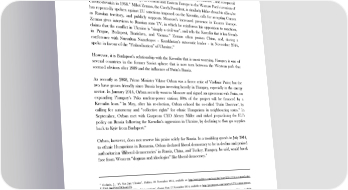 THE STATE OF DEMOCRACY AFTER 25 YEARS Although these regimes’ allies in Central and Eastern Europe include parties on the post- communist left, it is in relations with the populist and nationalist right where their strategy to build political alliances is most visible. The Prime Minister of Slovakia, Robert Fico, counts among the most vocal critics of the EU’s sanctions against Vladimir Putin’s regime, following Russia’s annexation of Crimea and the war in Ukraine’s east. Fico has called the sanctions “meaningless and counterproductive”, and compared the deployment of NATO troops in Central and Eastern Europe to the Warsaw Pact’s invasion of 41 Czechoslovakia in 1968. Miloš Zeman, the Czech President, is similarly blithe about his allies; he has repeatedly spoken against EU sanctions imposed on the Kremlin, calls for accepting Crimea as Russian territory, and publicly supports Moscow’s increased presence in Eastern Europe. Zeman gives interviews to Russian state TV, in which he reinforces his opposition to sanctions, claims that the conflict in Ukraine is “simply a civil war”, and tells the Kremlin that it has friends in Prague, Budapest, Bratislava, and Vienna.42 Zeman often praises China, and, during a conference with Nursultan Nazarbayev – Kazakhstan’s autocratic leader – in November 2014, spoke in favour of the “Finlandisation” of Ukraine.43 However, it is Budapest’s relationship with the Kremlin that is most worrying. Hungary is one of several countries in the former Soviet sphere that is now torn between the Western path that seemed obvious after 1989 and the influence of Putin’s Russia. As recently as 2008, Prime Minister Viktor Orban was a fierce critic of Vladimir Putin; but the two have grown friendly since Russia began investing heavily in Hungary, especially in the energy sector. In January 2014, Orban secretly went to Moscow and signed an agreement with Putin, on expanding Hungary’s Paks nuclear-power station; 80% of the project will be financed by a Kremlin loan.44 In May, after his re-election, Orban echoed the so-called ‘Putin Doctrine’, by calling for autonomy and “collective rights” for ethnic Hungarians in neighbouring states.45 In September, Orban met with Gazprom CEO Alexey Miller and risked jeopardising the EU’s policy on Russia following the Kremlin’s aggression in Ukraine, by declining to flow gas supplies back to Kyiv from Budapest.46 Orban, however, does not reserve his praise solely for Russia. In a troubling speech in July 2014, to ethnic Hungarians in Romania, Orban declared liberal democracy to be in decline and praised authoritarian ‘illiberal democracies’ in Russia, China, and Turkey. Hungary, he said, would break free from Western “dogmas and ideologies” like liberal democracy.47 41 Gedmin, J., ‘It’s Not Just Ukraine’, Politico, 30 November 2014, available at: http://www.politico.com/magazine/story/2014/11/its-not-just-ukraine- 113164.html#ixzz3Kkeny184. 42 ‘Zeman appears on Russian TV to blast sanctions’, Prague Post, 17 November 2014, available at: http://praguepost.com/eu-news/42701-zeman-appears- on-russian-tv-to-blast-sanctions. 43 Richter, J., ‘President Zeman proposes “Finlandization” of Ukraine’, Radio Praha, 26 November 2014, available at: http://www.radio.cz/en/section/curraffrs/president-zeman-proposes-finlandization-of-ukraine. 44 Traynor, I., ‘Budapest autumn: hollowing out democracy on the edge of Europe’, The Guardian, 29 October 2014, available at: http://www.theguardian.com/world/2014/oct/29/budapest-viktor-orban-democracy-edge-hungary. 45 Szakacs, G., ‘Orban renews autonomy call for ethnic Hungarians in Ukraine’, Reuters, 17 May 2014, available at: http://www.reuters.com/article/2014/05/17/us-ukraine-crisis-hungary-autonomy-idUSBREA4G04520140517. 46 Than, K., ‘Update 1-Hungary to Import More Gas from Gazprom, says PM Orban’, Reuters, 26 September 2014, available at: http://www.reuters.com/article/2014/09/26/hungary-gas-orban-idUSL6N0RR0W420140926. 47 Prime Minister Victor Orban’s Speech at the 25th Balvyanos Free University, Website of the Hungarian Government, available at: http://www.kormany.hu/en/the-prime-minister/the-prime-minister-s-speeches/prime-minister-viktor-orban-s-speech-at-the-25th-balvanyos-summer-free- university-and-student-camp 10
