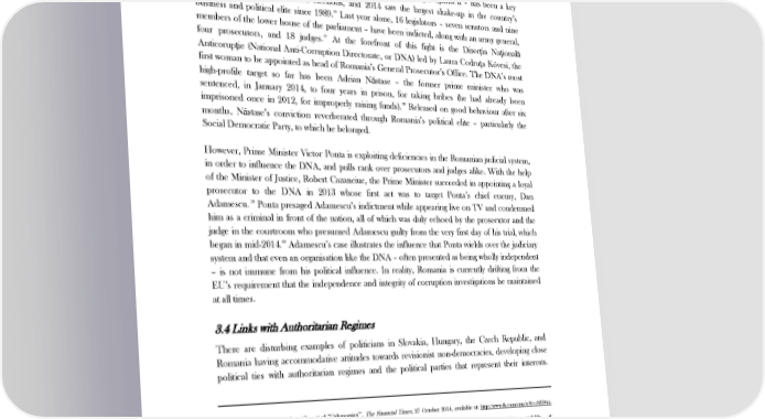 THE STATE OF DEMOCRACY AFTER 25 YEARS of waging a “verbal cold war” against Hungary – while Orban himself dismissed the sanctions as a 34 ‘flimsy piece of paper’. Nevertheless, Hungary’s National Tax and Customs Administration has been accused of turning a blind eye to VAT fraud committed by government associates and of bribing American companies – by using tax breaks – in return for funding policy papers that favour Orban’s administration.35 In Romania, the mingling of politics with corruption – and the fight against it – has been a key issue in successive presidential elections, and 2014 saw the largest shake-up in the country’s business and political elite since 1989.36 Last year alone, 16 legislators – seven senators and nine members of the lower house of the parliament – have been indicted, along with an army general, 37 four prosecutors, and 18 judges. At the forefront of this fight is the DirecĠia NaĠională AnticorupĠie (National Anti-Corruption Directorate, or DNA) led by Laura CodruĠa Kövesi, the first woman to be appointed as head of Romania’s General Prosecutor’s Office. The DNA’s most high-profile target so far has been Adrian Năstase – the former prime minister who was sentenced, in January 2014, to four years in prison, for taking bribes (he had already been imprisoned once in 2012, for improperly raising funds).38 Released on good behaviour after six months, Năstase’s conviction reverberated through Romania’s political elite – particularly the Social Democratic Party, to which he belonged. However, Prime Minister Victor Ponta is exploiting deficiencies in the Romanian judicial system, in order to influence the DNA, and pulls rank over prosecutors and judges alike. With the help of the Minister of Justice, Robert Cazanciuc, the Prime Minister succeeded in appointing a loyal prosecutor to the DNA in 2013 whose first act was to target Ponta’s chief enemy, Dan 39 Adamescu. Ponta presaged Adamescu’s indictment while appearing live on TV and condemned him as a criminal in front of the nation, all of which was duly echoed by the prosecutor and the judge in the courtroom who presumed Adamescu guilty from the very first day of his trial, which began in mid-2014.40 Adamescu’s case illustrates the influence that Ponta wields over the judiciary system and that even an organisation like the DNA – often presented as being wholly independent – is not immune from his political influence. In reality, Romania is currently drifting from the EU’s requirement that the independence and integrity of corruption investigations be maintained at all times. 3.4 Links with Authoritarian Regimes There are disturbing examples of politicians in Slovakia, Hungary, the Czech Republic, and Romania having accommodative attitudes towards revisionist non-democracies, developing close political ties with authoritarian regimes and the political parties that represent their interests. 34 Byrne, A., ‘Hungary grapples with cost of “Orbanomics”’, The Financial Times, 27 October 2014, available at: http://www.ft.com/cms/s/0/cc8f9944- 5b8e-11e4-81ac-00144feab7de.html. 35 Given, C. and Máté Hajba, ‘Continued Corruption in Hungary’, Forbes, 14 November 2014, available at: http://www.forbes.com/sites/realspin/2014/11/14/continued-corruption-in-hungary/. 36 ‘Oh, brother’, The Economist, 28 June 2014, available at: http://www.economist.com/news/europe/21605953-traian-basescu-ending-his-presidency- amid-corruption-scandal-oh-brother. 37 Higgins, A., ‘In a Soft-Spoken Romanian Prosecutor, Some See an “Earthquake”’, The New York Times, 14 November 2014, available at: http://www.nytimes.com/2014/11/15/world/europe/romania-prosecutor-laura-codruta-kovesi.html?_r=0. 38 ‘Romania ex-PM Adrian Nastase Jailed in Bribery Case’, BBC News, 06 January 2014, available at: http://www.bbc.co.uk/news/world-europe-25630091. 39 Dill, G. and Cora Motoc, ‘Briefing: On the Current State of EU Accession Criteria in Romania’, Konrad Adenauer Stiftung, available at: http://www.kas.de/wf/doc/kas_6834-1522-2-30.pdf?080806135953 40 ‘Legal Experts Advisory Paper’, Fair Trials, November 2014, available at: http://fairtrials.creative.ayima.com/wp-content/uploads/Presumption-of- Innocence-Position-Paper.pdf. 9