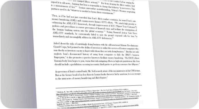 THE VIEW FROM TEHRANS TWILIGHT ZONE In Seif’s alternative reality, sanctions no longer exist so there is no risk to doing business in Iran. We now live in a “post-sanctions environment,” he said, ignoring the terrorism, ballistic missile, and human rights sanctions that remain in place. As for the claim that it is Iran’s own actions—executing 9 10 11 12 minors, persecuting religious minorities, sponsoring terrorism, testing ballistic missiles —that create the kind of risk and uncertainty that keep banks from doing business with Iran, Seif argued that’s nothing new. “If, according to our partners, it is our conduct which prevents international banks from engaging in business with us, they were fully aware of our conduct before singing the 13 [Iran deal]. We have not changed [these actions].” Far from denying the illicit conduct, Seif argued it is old news. Arguing that Iran is responsible to change that behavior “is not correct. This 14 is a misstatement of fact.” Iranian misconduct notwithstanding, Tehran’s Western negotiating 15 partners need to do “whatever is needed to honor their commitments.” Then, as if he had not just conceded that Iran’s illicit conduct continues, he touted Iran’s anti- money laundering (AML) and counter-terror finance (CFT) efforts. “We attach high priority to enhancing the AML/CFT framework, through improvement of KYC [“Know Your Customer”] policies and procedures to ensure prevention of financial crime and facilitate the reintegration of 16 the Iranian banking system into the global economy.” Noting Financial Action Task Force AML/CFT standards, he conveniently failed to note the group’s repeated calls for Iran “to 17 immediately and meaningfully address its AML/CFT deficiencies.” Asked about the risks of unwittingly doing business with the still-sanctioned Islamic Revolutionary Guard Corps, Seif pointed to the ability of investors to utilize the services of Iranian companies who 18 run checks so investors can try to know with whom they are truly doing business. But this not only neglects Iran’s documented history of using front companies to hide the IRGC’s business 19 fingerprint, it also promotes a practice known to facilitate money laundering. The FATF, whose Eurasia body Iran hopes to join, warns that risk-mitigating efforts in high-risk jurisdictions like Iran 20 should include a prohibition on using in-country third-parties to perform customer due diligence. As governor of Iran’s central bank, Mr. Seif is surely aware of the inconsistencies in his CFR lecture. But as the former head of no less than six Iranian banks that were hit by sanctions, he is no stranger 21 to the intricacies of money laundering and illicit finance. 9 Gladstone, R., ‘Iran Still a Leading Executioner of Minors, Report Says’, The New York Times, 25 January 2016, available at: http://www.nytimes.com/2016/01/26/world/middleeast/iran-still-a-leading-executioner-of-minors-report-says.html?_r=1, last visited: 11 May 2016. 10 ‘Iranian Judiciary Took No Action despite Formal Complaint Detailing Torture of Baha’is in Prison’, International Campaign for Human Rights in Iran, 27 March 2016, available at: https://www.iranhumanrights.org/2016/03/twelve-bahais-allege-torture-in-detention/, last visited: 11 May 2016. 11 Levitt, M & Segawa, K., ‘Findings from the State Department's Annual Terrorism Report (Part 1): Hezbollah and Iran’, The Washington Institute, 19 June 2016, available at: http://www.washingtoninstitute.org/policy-analysis/view/findings-from-the-state-departments-annual-terrorism-report-part-1- hezbolla, last visited: 11 May 2016. 12 ‘Treasury Sanctions Those Involved in Ballistic Missile Procurement for Iran’, US Treasury, 17 January 2016, available at: https://www.treasury.gov/press-center/press-releases/Pages/jl0322.aspx, last visited: 11 May 2016. 13 ‘A Conversation with Valiollah Seif’, Council on Foreign Relations, 15 April 2016, available at: http://www.cfr.org/global/conversation-valiollah- seif/p37733, last visited: 11 May 2016. 14 Ibid. 15 Ibid. 16 Ibid. 17 Ibid. 18 Ibid. 19 ‘Sanctions relief increases risk of IRGC front companies concealing illegal shipments in legitimate Iranian maritime cargo’, IHS Janes 360, 17 March 2016, available at: http://www.janes.com/article/58859/sanctions-relief-increases-risk-of-irgc-front-companies-concealing-illegal-shipments-in-legitimate- iranian-maritime-cargo, last visited: 11 May 2016. 20 Bauer, K, ‘Iran's Long Road to Reintegrating With the World Financial System’, The Washington Institute, 29 February 2016, available at: http://www.washingtoninstitute.org/policy-analysis/view/irans-long-road-to-reintegrating-with-the-world-financial-system, last visited: 11 May 2016. 21 Dubovitz, M & Fixler, A, ‘Iran’s Center for Illicit Finance’, Foundation for Defense of Democracies’, 15 April 2016, available at: http://www.defenddemocracy.org/media-hit/dubowitz-mark-irans-center-for-illicit-finance/, last visited: 11 May 2016. 2