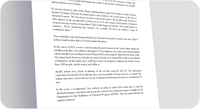 TOWARDS A COHERENT WESTERN POLICY ON THE SYRIAN WAR It is, of course, impossible to say what the outcome would have been had the US begun to offer large-scale material support and training to the Syrian armed rebellion in 2012. Pro-rebel advocates naturally assert that the result would have been a swift end to the war and the avoidance of the subsequent terrible loss of life in Syria. However, there are various alternative scenarios whereby the mainly Sunni rebellion, had it defeated the regime, might have exacted a terrible revenge against the regime-supporting and non-Sunni parts of the population. Such debates are by their very nature sterile. In any case, this support did not take place. And by mid-2013, the emergence of large and powerful Sunni Islamist groups had changed the reality on the ground and therefore the possible options and the terms of debate. In one area, however, critics of the Obama Administration’s approach to Syria are surely on firmer ground. In August, 2012, the President issued a clear red line to the Assad regime on the issue of chemical weapons. “We have been very clear to the Assad regime,” the president said, “but also to other players on the ground, that a red line for us is we start seeing a whole bunch of chemical weapons moving around or being utilized. That would change my calculus. That would change my equation … We’re monitoring that situation very carefully. We have put together a range of 8 contingency plans.” This sounds like a clear declaration that the use of chemical weapons by Assad or any other “player” in Syria would result in direct US action against that player. In the course of 2013, a series of attacks using chemical weapons by the Assad regime against the rebellion took place. According to subsequent UN investigations, the regime used sarin gas against rebel-controlled areas in Khan al-Asal (19 March 2013) and Saraqib (29 April 2013) in Syria’s north. The largest attack, however, took place in eastern Ghouta on 21 August 2013, in the eastern suburbs of Damascus. In this attack, up to 1,000 kg of sarin was dropped, resulting in the deaths of more 9 than 1,000 people, mainly women and children. Assad’s actions were clearly in defiance of the red line issued by the US. The subsequent expectation was that the US would take direct action, probably involving air power, to “punish” the regime and seek to restore the ban on use of chemical and biological weapons as an instrument of war. In the event, a “compromise” was reached, according to which Syria would agree to sign the chemical weapons convention and accept the removal of its chemical weapons stockpiles by the Organisation for the Prohibition of Chemical Weapons (OPCW). This was largely (though not 10 entirely) achieved. 8 Glenn Kessler, ‘President Obama and the “Red Line” on Syria’s chemical weapons’, Washington Post, 6 September 2013, available at: https://www.washingtonpost.com/news/fact-checker/wp/2013/09/06/president- obama-and-the-red-line-on-syrias-chemical-weapons/, last visited: 29 March 2016. 9 ‘Syria chemical attack: what we know’, BBC Online, 24 September 2013, available at: http://www.bbc.co.uk/news/world-middle-east-23927399, last visited: 29 March 2016. 10 ‘Destruction of Syria’s chemical weapons completed’, Organization for the Prohibition of Chemical Weapons, 4 January 2016, available at: https://www.opcw.org/news/article/destruction-of-syrian-chemical- weapons-completed/, last visited: 29 March 2016. 8