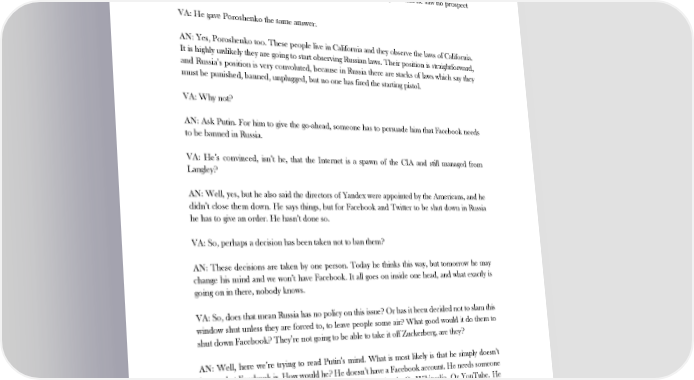 WHAT IS THE RUSSIAN FOR FACEBOOK? press releases about how productive the dialogue is which they are having with Facebook and Twitter, and how the heads of Facebook and Twitter have been flying to Russia to have talks with them. All the information on this topic is coming from Roskomnadzor. They have no authority to block the networks so, to keep smiling while playing a terrible hand, they issue infinite numbers of leaks and press releases to media who are on their side, about how everybody is flying in to see them. Mark Zuckerberg was in Russia when Dmitry Medvedev was president, and the president asked him to open an offshoot of Facebook in Russia. Zuckerberg replied that he saw no prospect of that happening. VA: He gave Poroshenko the same answer. AN: Yes, Poroshenko too. These people live in California and they observe the laws of California. It is highly unlikely they are going to start observing Russian laws. Their position is straightforward, and Russia’s position is very convoluted, because in Russia there are stacks of laws which say they must be punished, banned, unplugged, but no one has fired the starting pistol. VA: Why not? AN: Ask Putin. For him to give the go-ahead, someone has to persuade him that Facebook needs to be banned in Russia. VA: He’s convinced, isn’t he, that the Internet is a spawn of the CIA and still managed from Langley? AN: Well, yes, but he also said the directors of Yandex were appointed by the Americans, and he didn’t close them down. He says things, but for Facebook and Twitter to be shut down in Russia he has to give an order. He hasn’t done so. VA: So, perhaps a decision has been taken not to ban them? AN: These decisions are taken by one person. Today he thinks this way, but tomorrow he may change his mind and we won’t have Facebook. It all goes on inside one head, and what exactly is going on in there, nobody knows. VA: So, does that mean Russia has no policy on this issue? Or has it been decided not to slam this window shut unless they are forced to, to leave people some air? What good would it do them to shut down Facebook? They’re not going to be able to take it off Zuckerberg, are they? AN: Well, here we’re trying to read Putin’s mind. What is most likely is that he simply doesn’t know what Facebook is. How would he? He doesn’t have a Facebook account. He needs someone to give him a report that there is something called Facebook. Or Wikipedia. Or YouTube. He needs someone to come up with a report on the subject. But that person would need to have a goal. When someone comes to Putin and says, “We need to punish such-and-such a bank,” the aim is to help themselves to it. What good would it do them to shut Facebook down? They’re hardly going to be able to take it off Zuckerberg, are they? If nobody has a vested interest, nobody submits a report. 13