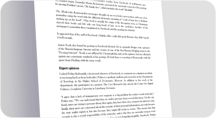 WHAT IS THE RUSSIAN FOR FACEBOOK? There was no way that could be regarded as accidental. Without waiting for more stringent treatment, Ksenzov left Facebook with his head held high, as he reported on Twitter. Maxim Ksenzov was in fact the second well known casualty of the ban on the offending word. The first, two days previously, had been Eduard Bagirov, a writer of fiction. Facebook responded on that occasion to a request from Roskomnadzor to explain the situation: “The word ‘khokhly’ in this context falls into the category of use of words such as ‘nigger’, and violates community standards.” After the blocking of Ksenzov, a demonstrative exodus from Facebook of well-known pro- Kremlinites began. Journalist Maxim Kononenko provoked the automatic removal of his posting by quoting Pushkin’s poem, “My family tree”, which includes the word “khokhly”. The Moskovsky Komsomolets newspaper thought up an even better provocation, with one of its journalists using the word with the different dictionary meaning of “a tuft of hair, fur or feathers sticking up on the head”. (This word is actually the origin of the derogatory term, as Ukrainians shaved their heads and left only one long braid of hair on it: the oseledets.) Another of the newspaper’s journalists then complained to Facebook and the posting was deleted. It appeared that, if the staff of Facebook’s Dublin office really did speak Russian, they didn’t speak it well enough. Anton Nosik also found his posting on Facebook blocked. He is a popular blogger, was a pioneer of the Russian-language Internet and the creator of one of the first Russian blogging projects, the “Evening Internet”. Nosik is not afflicted by Ukrainophobia and, in his opinion, had not offended against any community standards in his posting. He had done a re-posting of Kononenko with the quote from Pushkin, with the same result. Expert opinions I asked Polina Kolozaridi, a keen-eyed observer of Facebook, to comment on a situation in which it was being fired on from both sides. Polina is a graduate student and researcher at the Department of Sociology in the Higher School of Economics, Moscow. In addition to her work at the department, she participates in a project, The User Research Lab, run by the Centre for Digital Cultures, Leuphana University in Lüneburg, Germany. “I agree that a lack of transparency over requests is a big problem for today’s social networks,” Polina says. “We can understand that they are under pressure from several directions. On the one hand, states are trying to pressure them; then again, they have their own, commercial, interests; and, finally, their users are concerned about the security of their personal information, not only because the state might exploit it, but also because they might fall victim to scams. This means that data security is also a social responsibility of the networks, and is why they are currently trying to work out some rules. In my opinion, it is a great pity they are not doing that in public. Facebook, Twitter and other companies are going to spring a ready-made solution on us and tell us that these are the new rules. It shows how questionable the assumption is that the social networks are a public space: they are, of course, but the public space is privately owned. If you were conducting debates in a park, and the owner of the park came along and told you the rules for debating there had just been changed, you would find yourself in a ridiculous situation. Because, there you were, thinking the park was your public space. Unfortunately, I can’t think of any encouraging precedents here. Users have never yet succeeded in establishing a right to make decisions within corporations.” 8